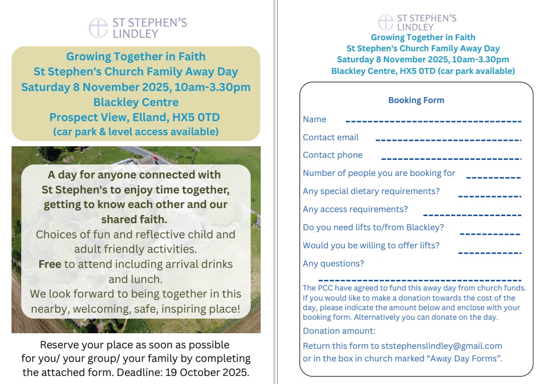 Please sign up by 19 October - see attached flyer for details. You can type the requested information in an email or fill in a paper form in church.