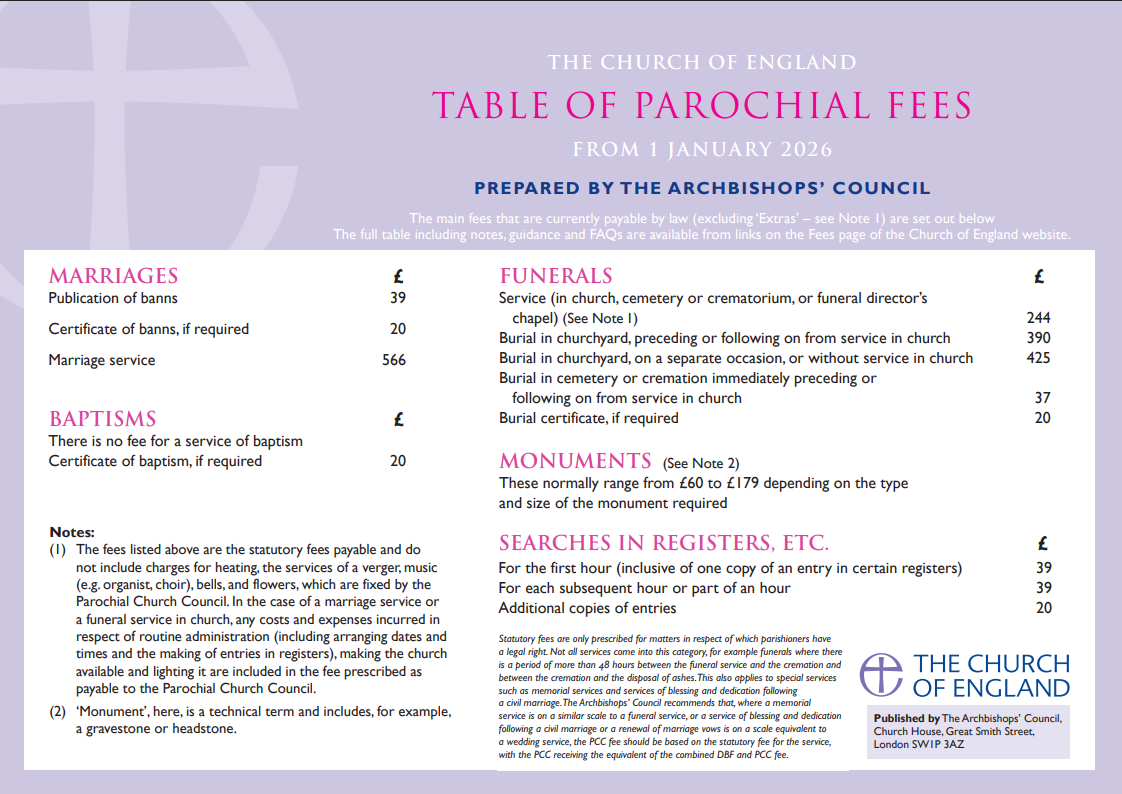A summary of the Church of England Fees 2026 for Life Events (Weddings, Funerals and Burials) is attached.