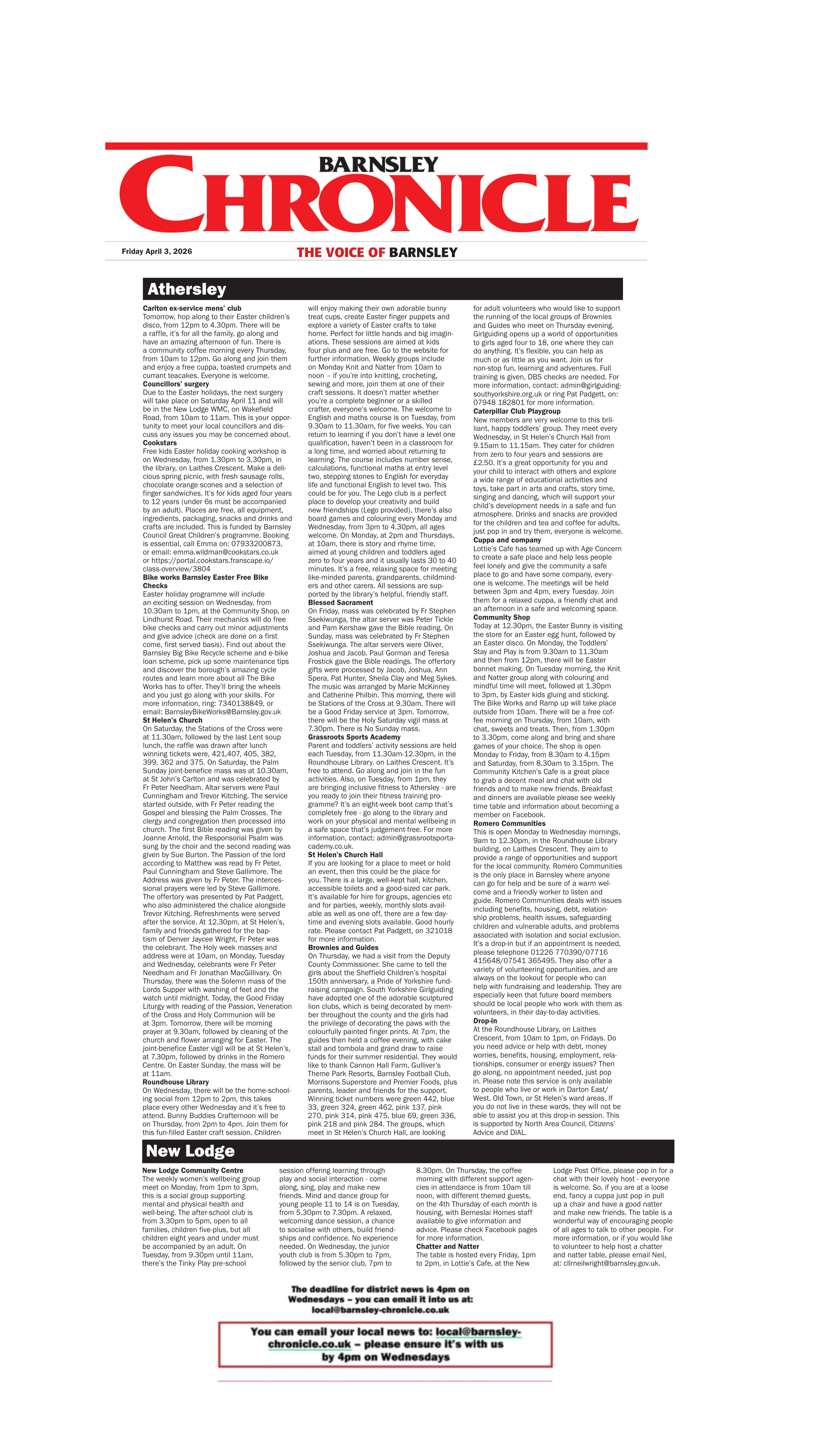 What's On this week in Athersley (including at St. Helen's Church and Athersley Parish Hall), New Lodge and Carlton (including at St. John the Evangelist Church and Carlton Parish Hall). As printed in the Barnsley Chronicle on Friday 3rd April 2026.