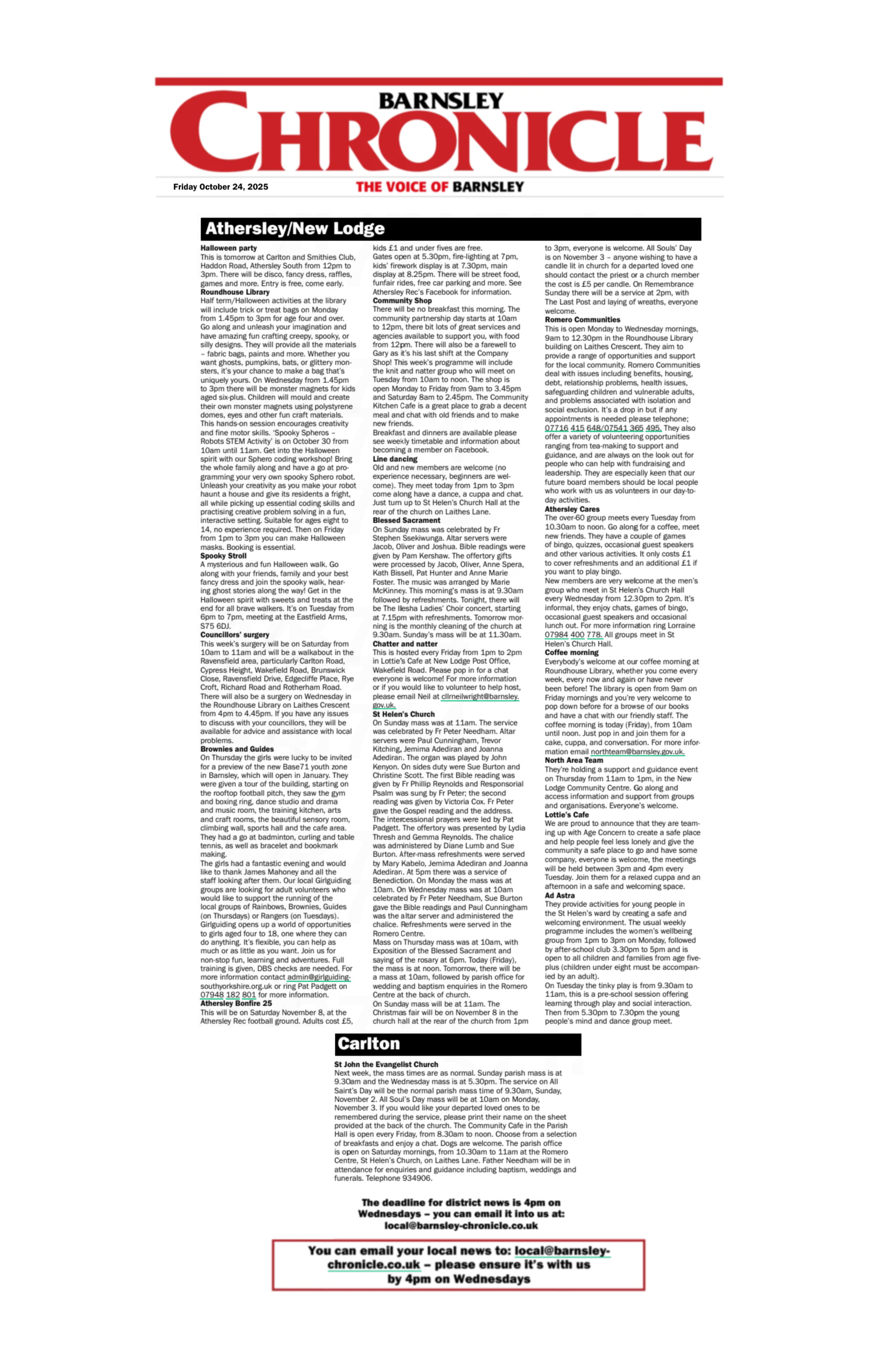 What's On this week in Athersley (including at St. Helen's Church and Athersley Parish Hall), New Lodge and Carlton (including at St. John the Evangelist Church and Carlton Parish Hall). As printed in the Barnsley Chronicle on Friday 24th October 2025.