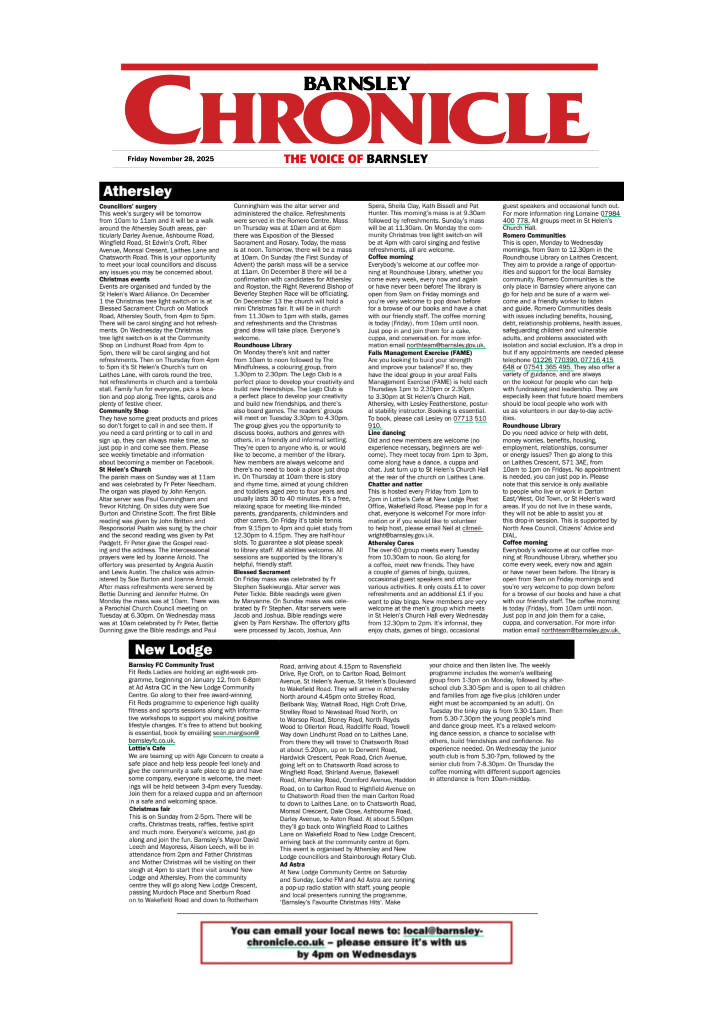 What's On this week in Athersley (including at St. Helen's Church and Athersley Parish Hall), New Lodge and Carlton (including at St. John the Evangelist Church and Carlton Parish Hall). As printed in the Barnsley Chronicle on Friday 28th November 2025.