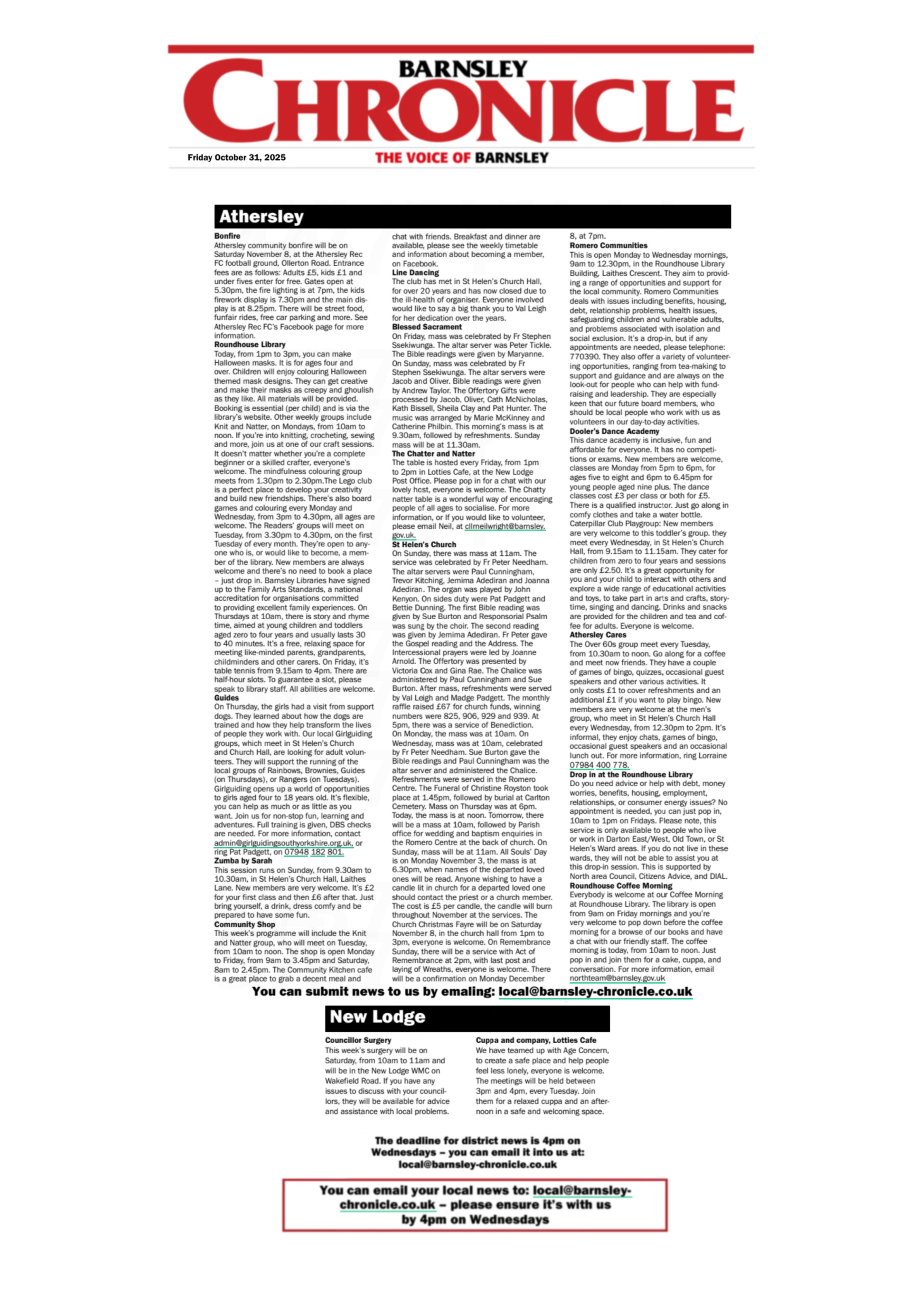 What's On this week in Athersley (including at St. Helen's Church and Athersley Parish Hall), New Lodge and Carlton (including at St. John the Evangelist Church and Carlton Parish Hall). As printed in the Barnsley Chronicle on Friday 31st October 2025.