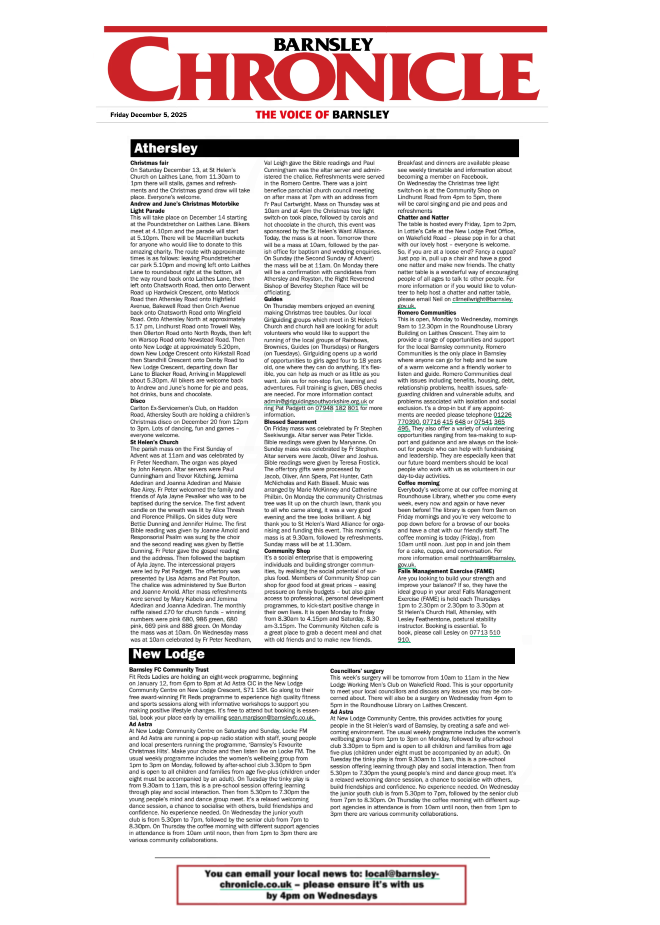 What's On this week in Athersley (including at St. Helen's Church and Athersley Parish Hall), New Lodge and Carlton (including at St. John the Evangelist Church and Carlton Parish Hall). As printed in the Barnsley Chronicle on Friday 5th December 2025.