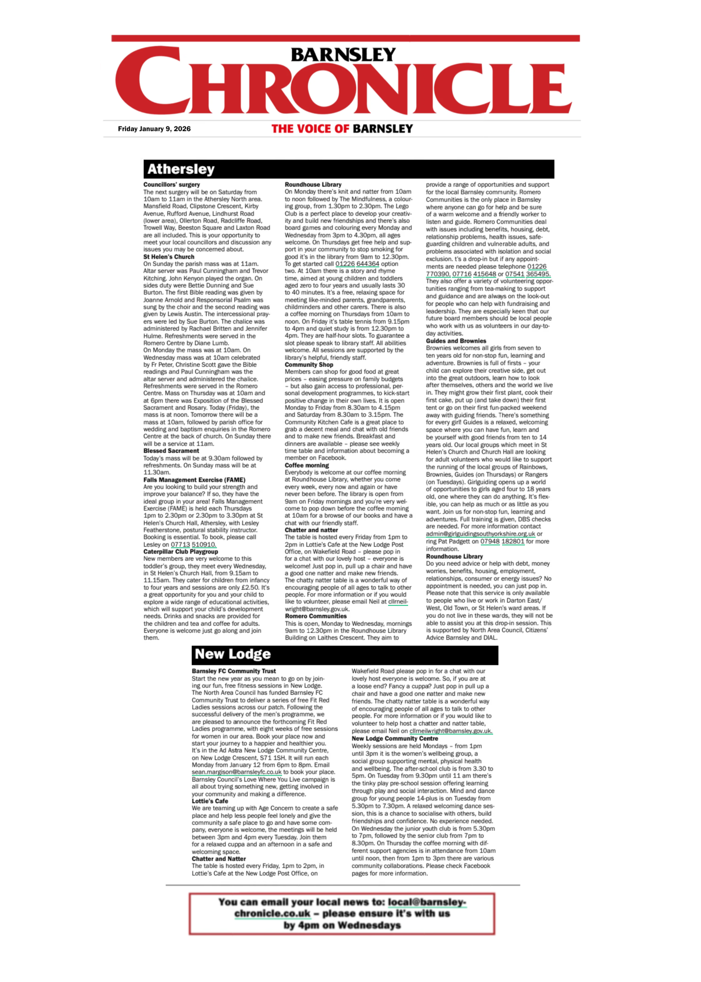 What's On this week in Athersley (including at St. Helen's Church and Athersley Parish Hall), New Lodge and Carlton (including at St. John the Evangelist Church and Carlton Parish Hall). As printed in the Barnsley Chronicle on Friday 9th January 2026.