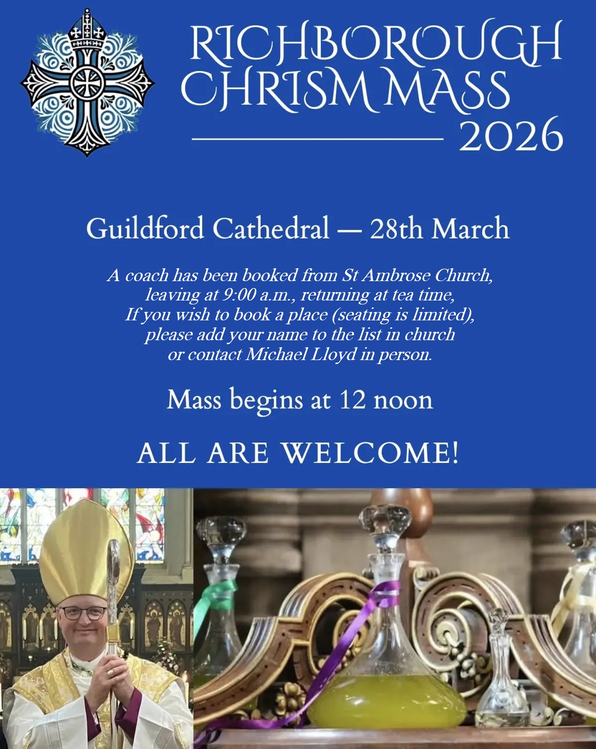 A small coach will be leaving St Ambrose Church at 9:00 a.m. for our Richborough Chrism Mass which, this year, will take place in Guildford Cathedral at noon. The Bishop of Richborough will preside and Fr Adrian will be among the concelebrating priests. There is a Cathedral Refectory, or you may prefer to bring a packed lunch.