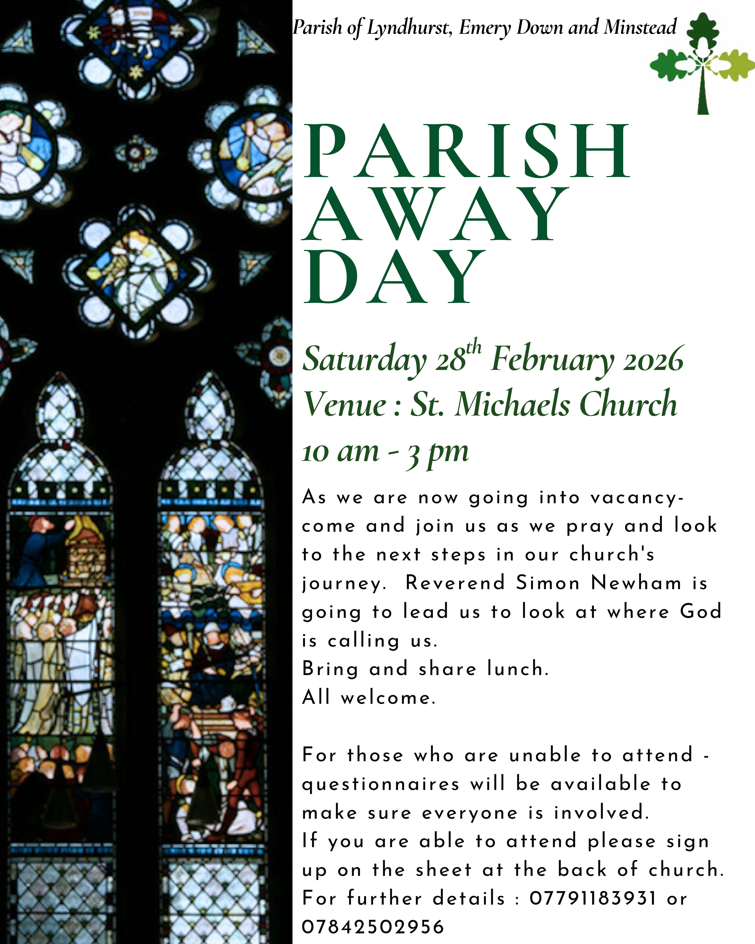 A Parish Away Day is arranged for the 28th February at St Michael and All Angels’ Church, Lyndhurst, from 10 am to 3 pm, for all who would like to come. The Reverend Simon Newham, Area Dean and Interim Archdeacon has agreed kindly to lead the day. A time for us to reflect, get to know each other a bit better, have some fun and really think and pray what is God calling us to do next? What are the priorities we should focus on? This would enable us to start writing our Parish Profile and start the community engagement we need to undertake as we move forward in appointing a new Rector.