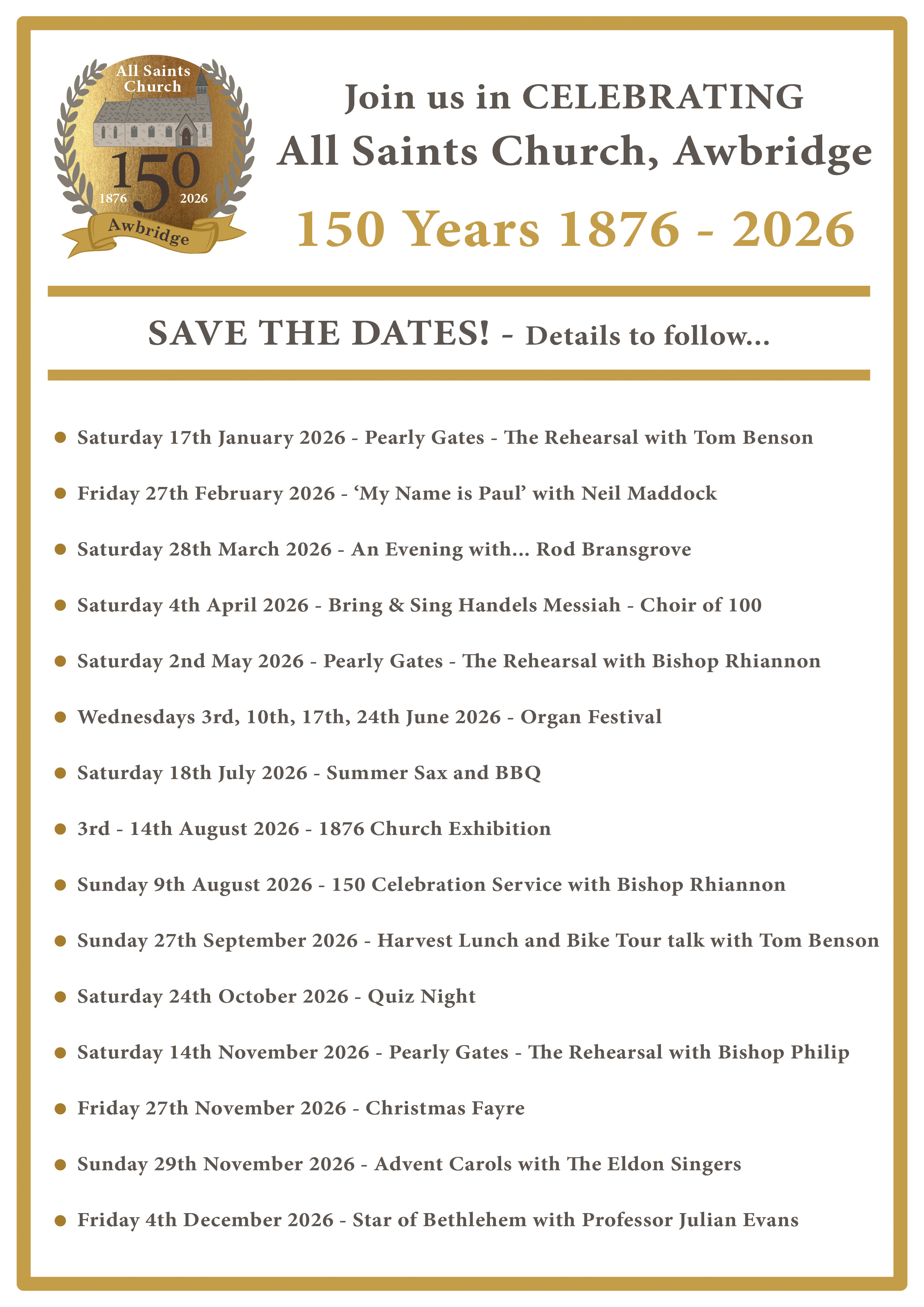 2026 will be a very significant year for All Saints Church Awbridge as we will be celebrating our 150th birthday throughout the year with a series of varied and exciting events for the whole community.
