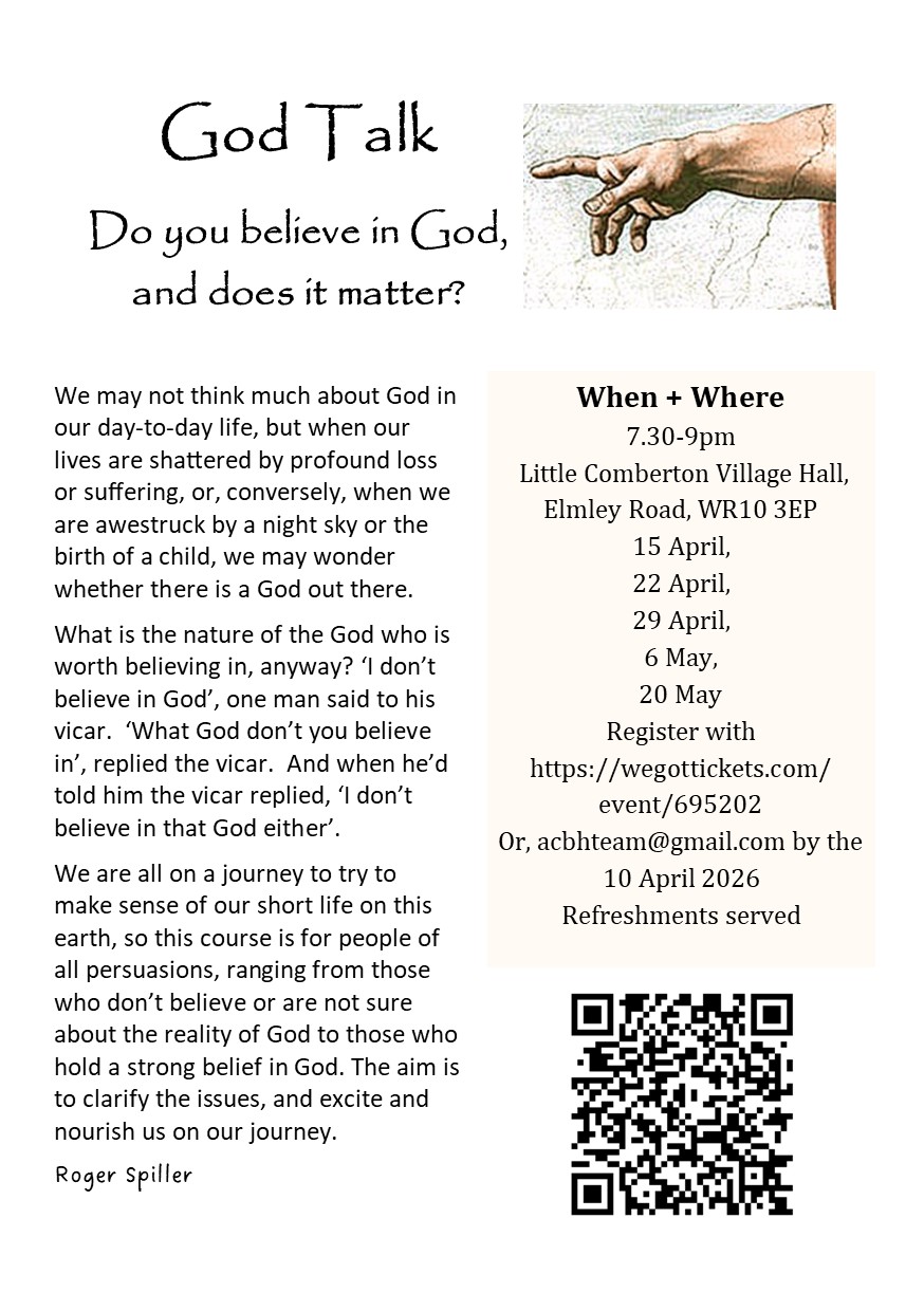 A series of five talks with Canon Roger Spiller commencing on the 15th April at The Village Hall in Little Comberton. Each session runs from 7.30pm to 9pm. See the attached poster for more details of how to sign up.