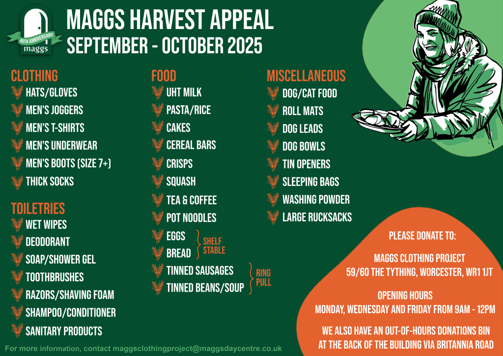 Tinned produce, toiletries and clothing will be collected and donated to Kidderminster Foodbank and Maggs Harvest Appeal 2025.
