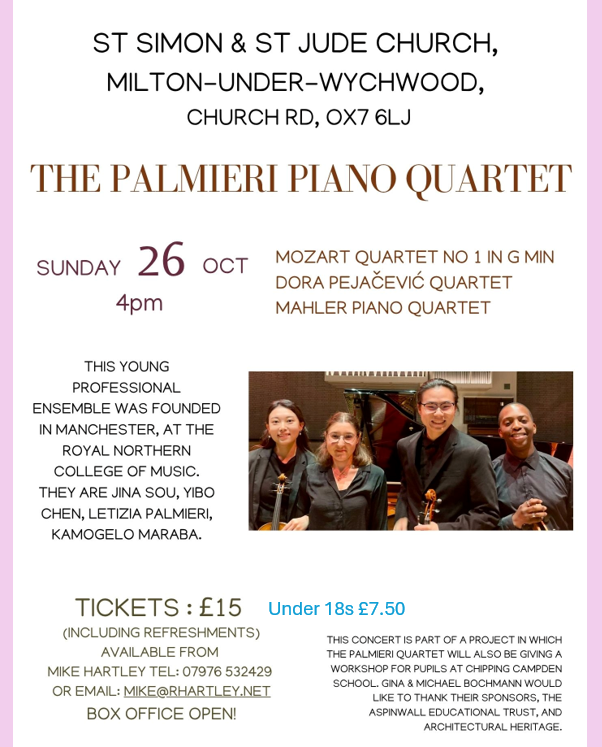 Concert in Milton Church - The Palmieri Piano Quartet. Tickets £15, Under 18s £7.50 (include refreshments ) from Mike [email protected]