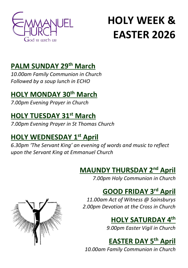 Good Friday 11am Act of Witness outside Sainsburys, 2pm Devotion at the Cross in Church