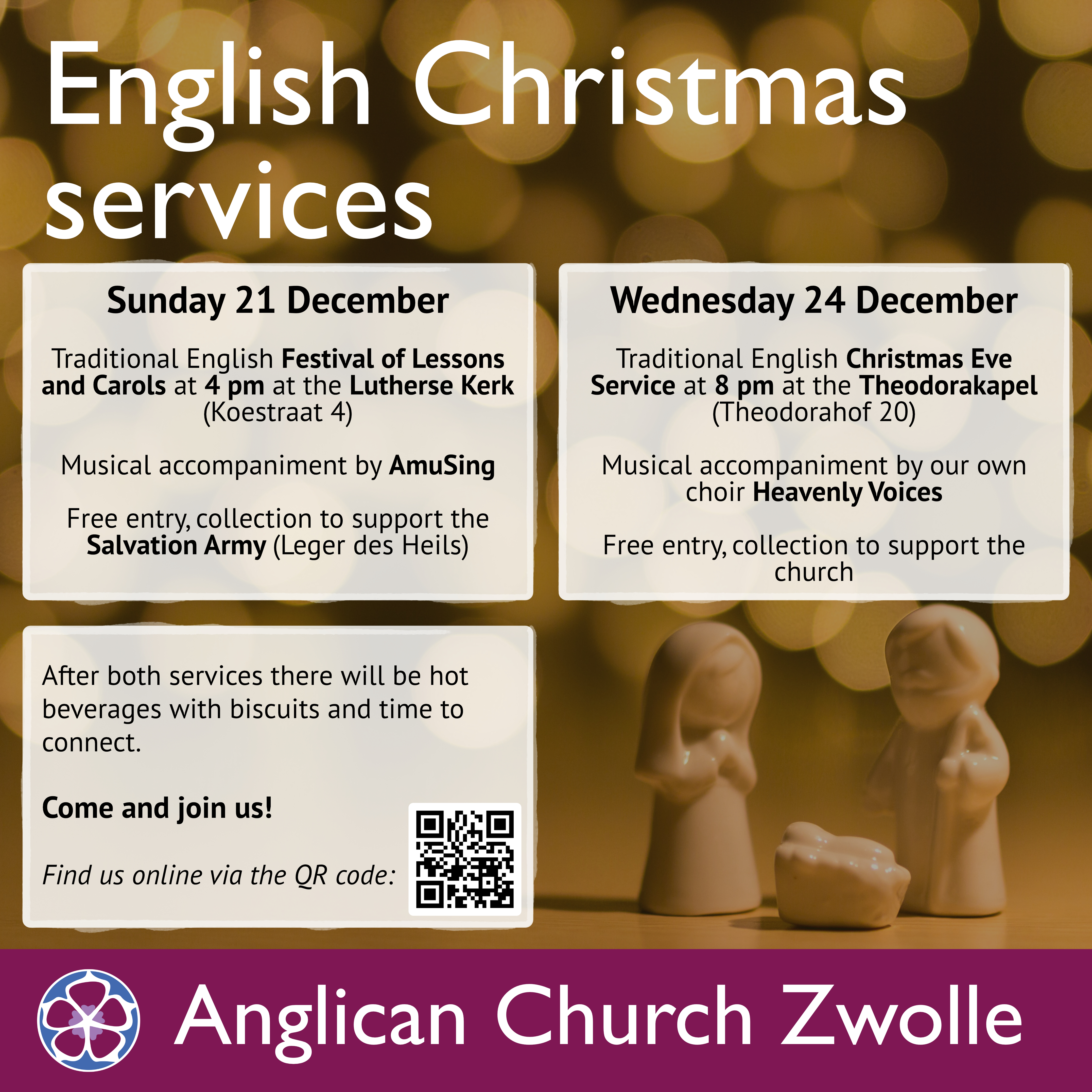 A very festive traditional Anglican service to celebrate Christmas by reading Lessons and singing Carols together. The communal singing is supported by the ladies of AmuSing choir. Afterwards there will be coffee/tea and baked goods. The service will start at 4pm dutch time, please feel welcome to join and bring friends.