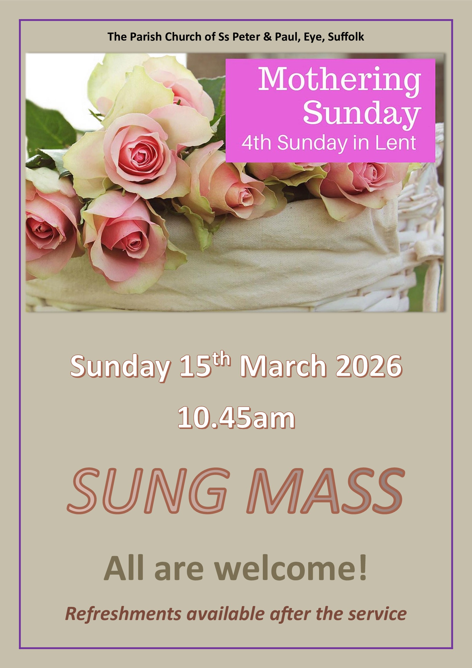 A special service to celebrate Mothering Sunday (also known as Laetare Sunday, Refreshment Sunday, or Rose Sunday).