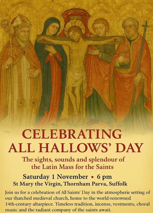 On Saturday 1 November, Fr Paul Andrews will be celebrating Mass for the Feast of All Saints, at 6pm in the exquisite little church of St Mary, Thornham Parva, near Eye in Suffolk. The Mass ordinary and propers will be sung entirely to plainsong by a small schola. Everyone is very welcome.
