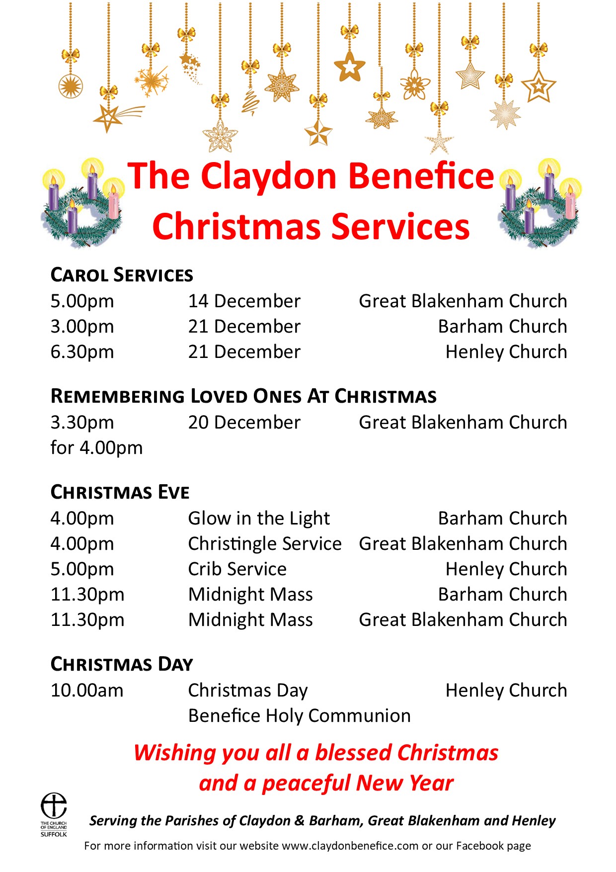 This Weekend Focus shifts to Gt Blakenham this weekend when Father Christmas will be in Church on Saturday and the Christmas Fayre takes place from 11am to 2pm in the Parish Room. You can view the decorated Christmas Trees in Church on Saturday and Sunday, The weekend finishes with the GB Carol Service at 5pm on Sunday.