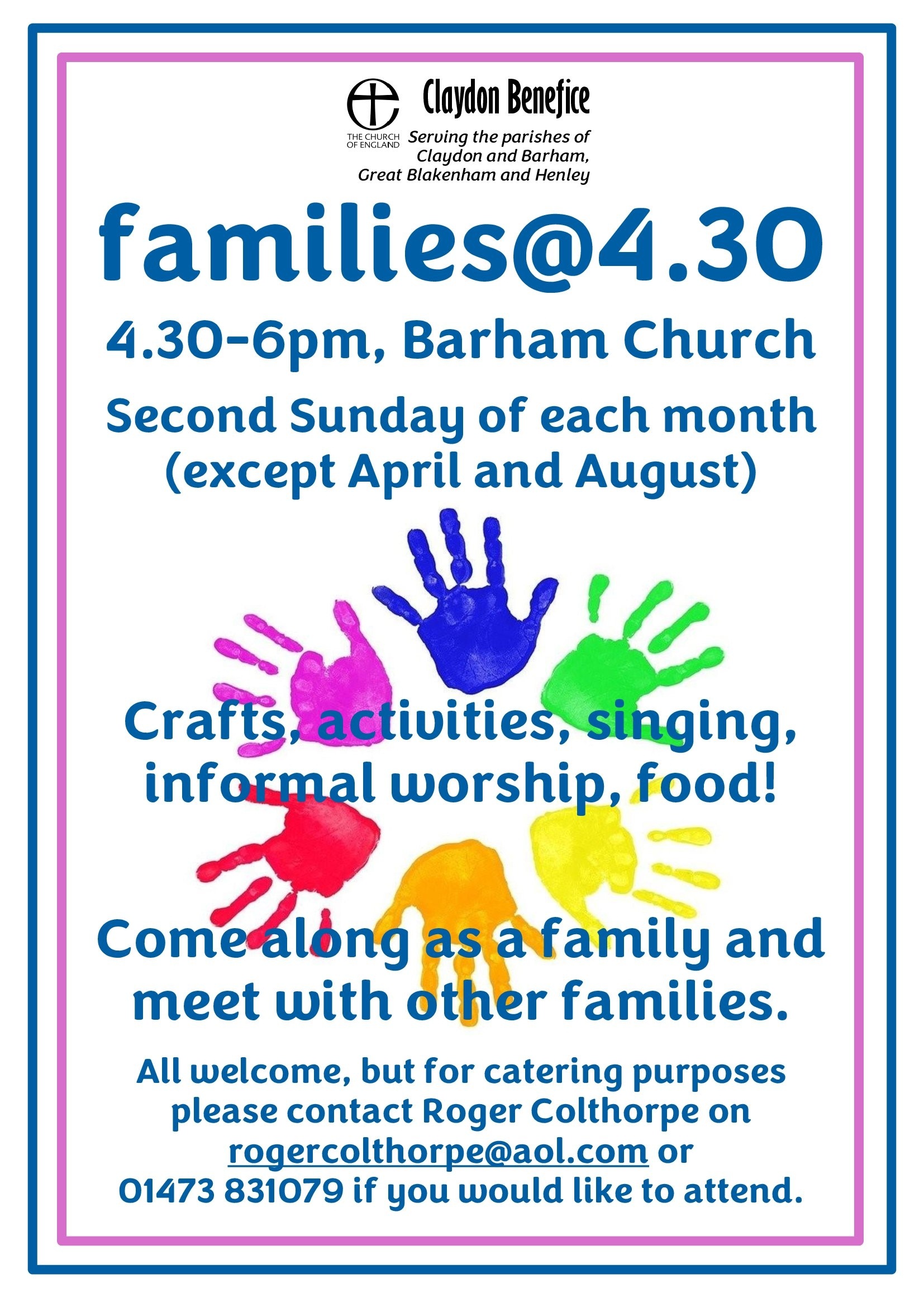 This is a congregation of families with children from across the Benefice and beyond that meets on the first (or sometimes the second) Sunday of every month apart from August. We start at 4.30pm and the usual pattern is a 40 minute period of crafts in the Church hall before moving to the adjacent Church for a short, lively 20 minutes of worship and then returning to the hall for a sit down meal and fellowship. The aim is that we finish by 6pm so that families can get home to put younger people to bed. However many tend to stay on chatting and making new friends. In July this congregation and the morning congregations come together for a barbecue on the grass behind the Church which is always hugely popular. A bouncy castle tends to keep the youngsters happy.