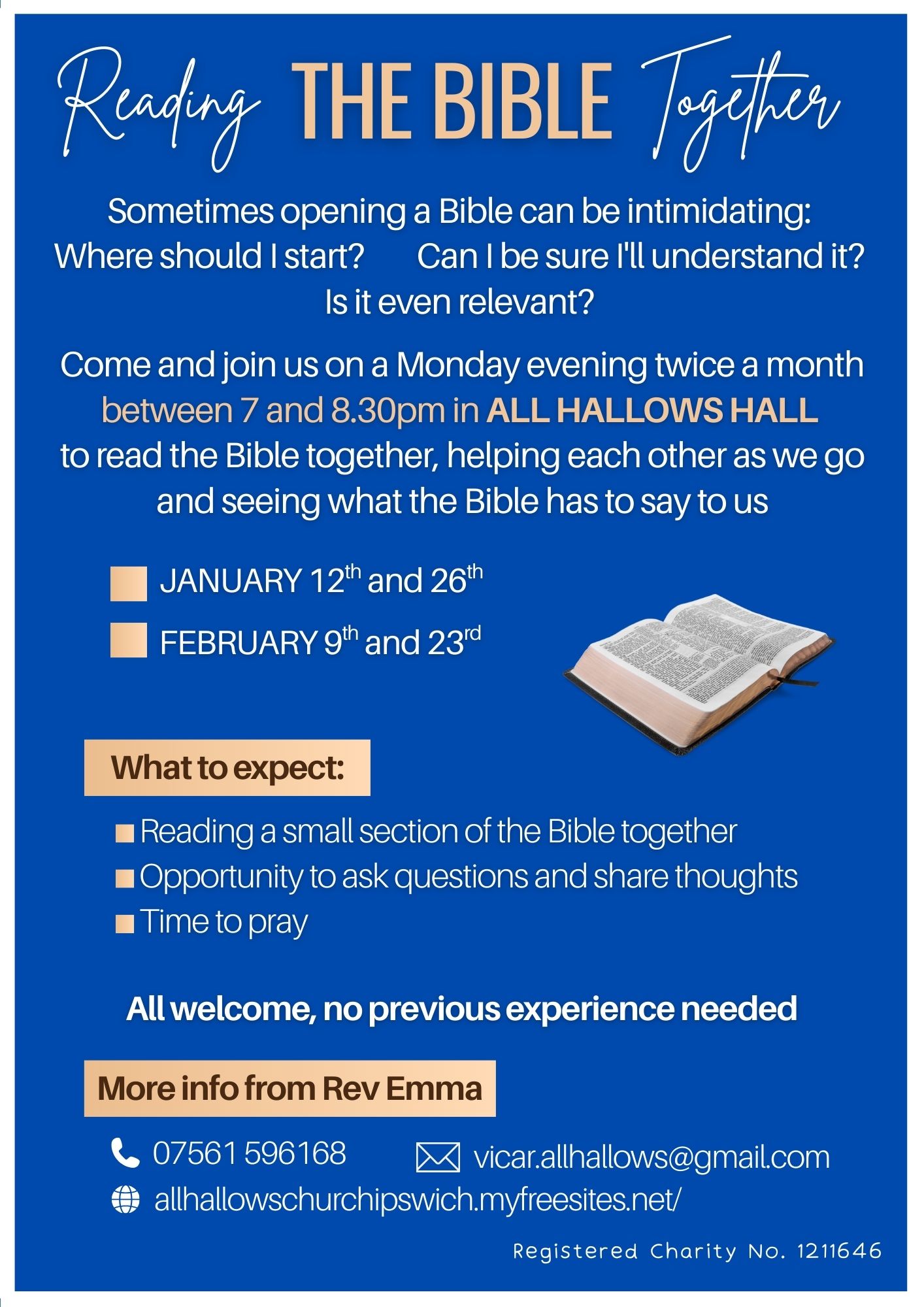 Come and join us on a Monday evening twice a month between 7 and 8pm in ALL HALLOWS CHURCH HALL to read the Bible together, helping each other as we go and seeing what the Bible has to say to us