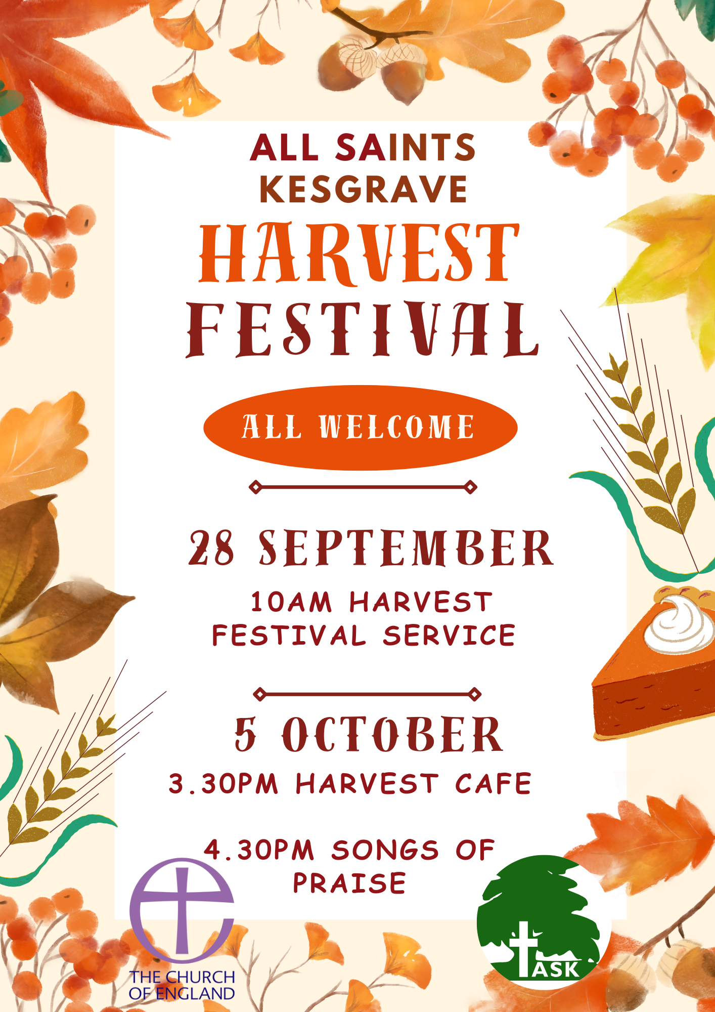 o All Saints, Kesgrave – Harvest Café at 3:30pm, followed by Harvest Songs of Praise with the band at 4:30pm.