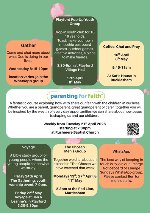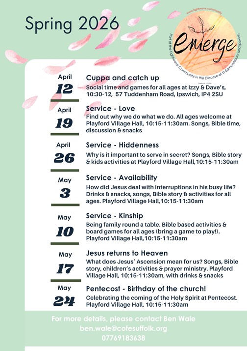 Playford Village Hall, 10:15–11:30am. Songs, Bible time,