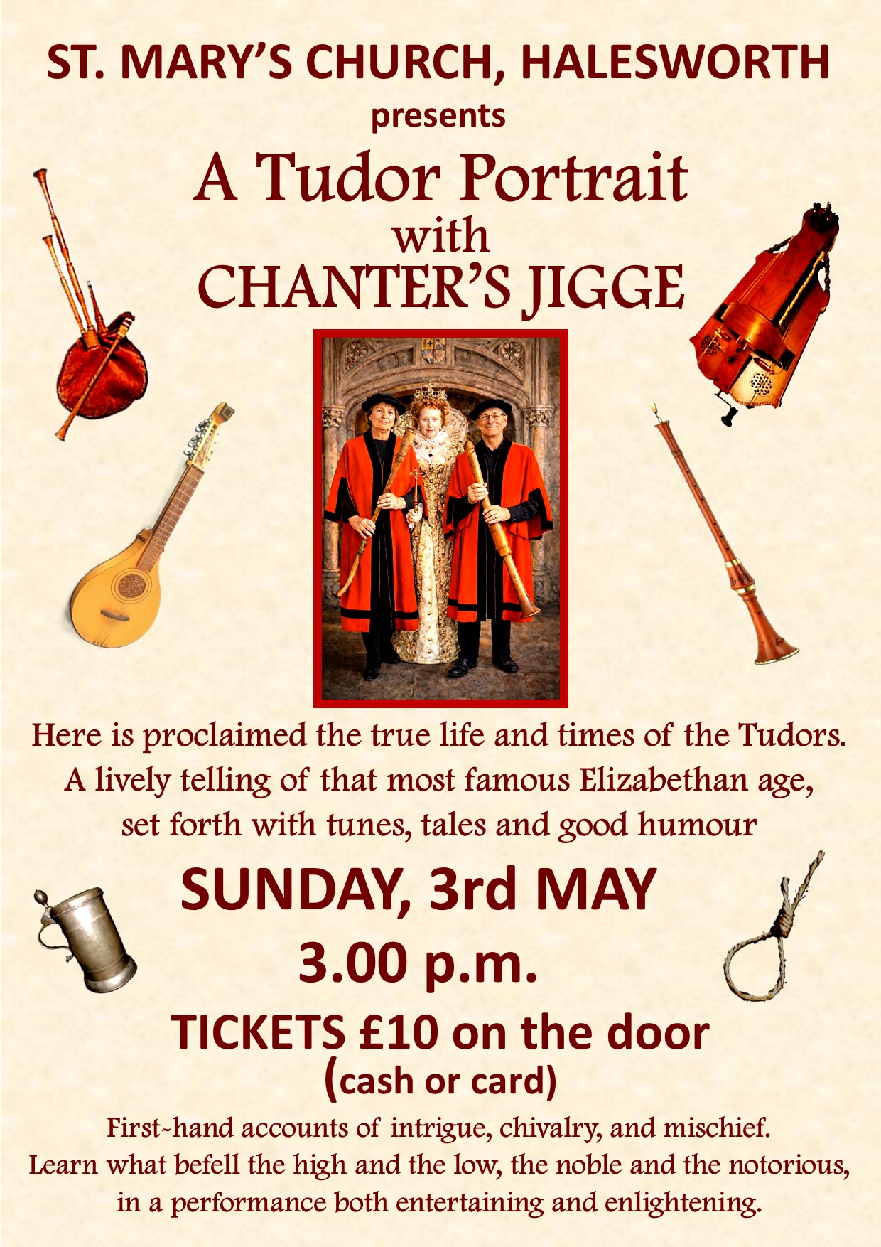 Step back in time with “A Tudor Portrait” performed by Chanter’s Jigge. Expect a lively mix of music, storytelling, and humour bringing the Tudor age vividly to life. Tickets £10 on the door. Information attached.