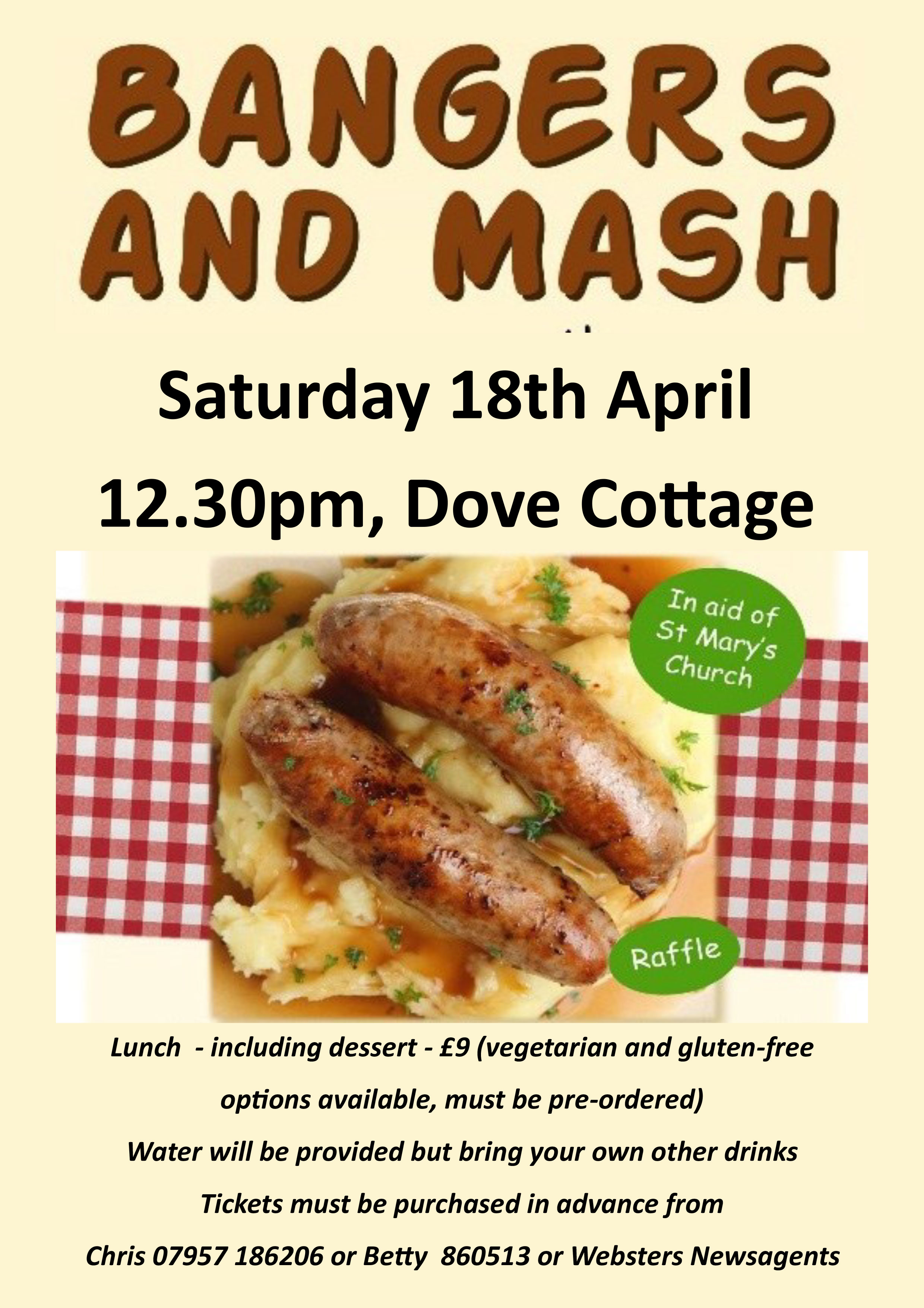 Join us for bangers and mash lunch on Saturday 18th April in Dove Cottage.
