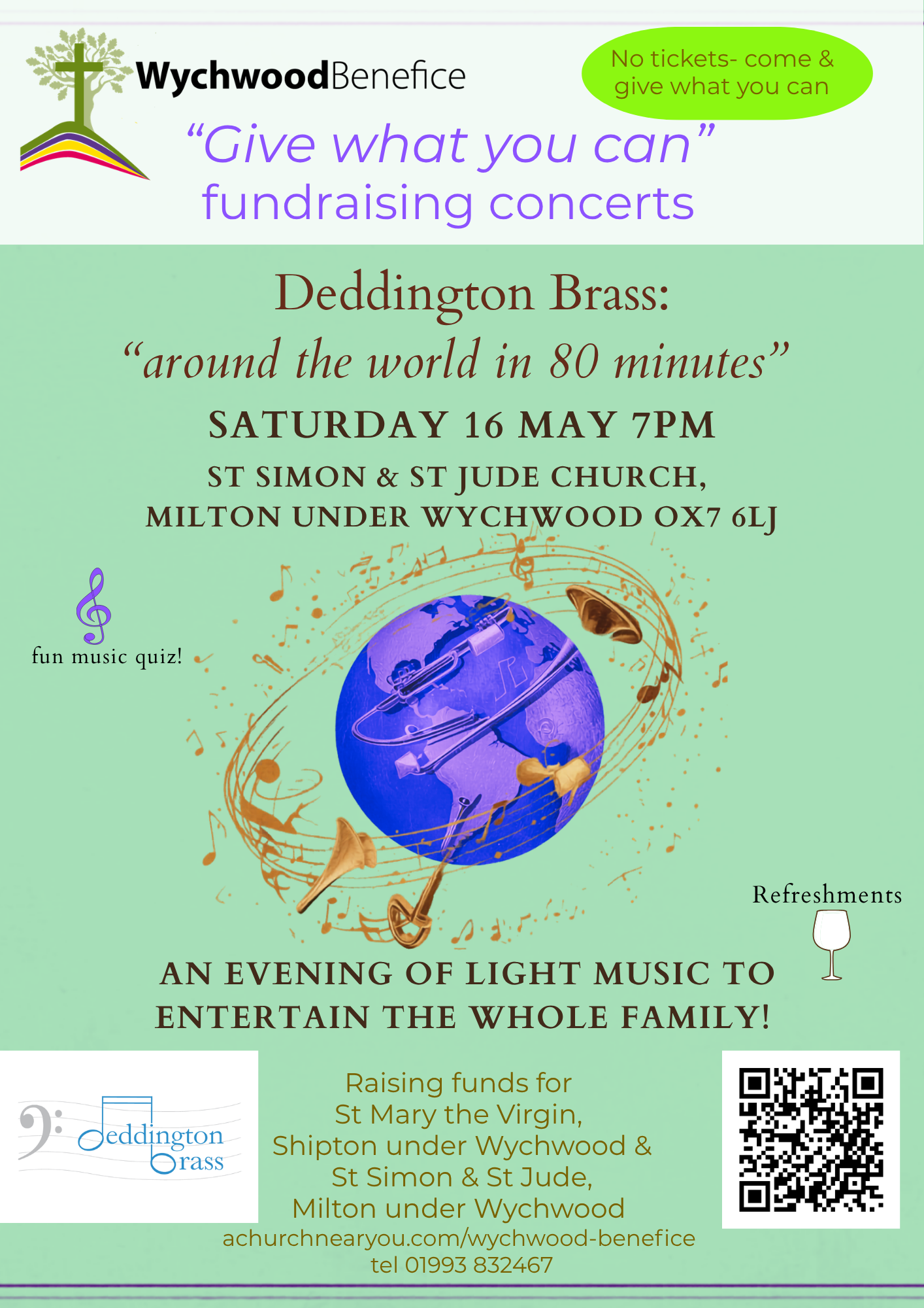 Next concert: Deddington Brass: Around the World in 80 Minutes. Saturday 16 May 7pm in St Simon & St Jude Church, Milton under Wychwood. See attached leaflet for full details.