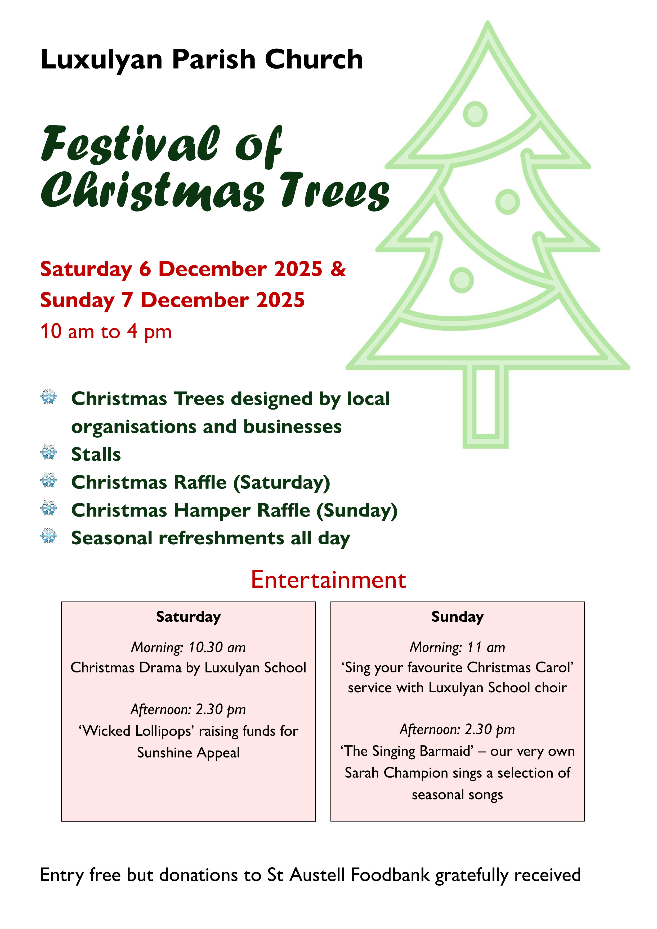 Welcome to the website of Luxulyan Parish Church.  We are situated in Mid Cornwall, not far from the Eden Project. We are committed to serving our community; we have a collection box for the Foodbank in St Austell and have regular prayer walks in the parish. We are blessed to be situated on the Saints Way and Cornish Celtic Way long distance walking trails. We welcome you to our church which is open during daylight hours for visitors.  Refreshments are always available for you to help yourself at the back of the church.