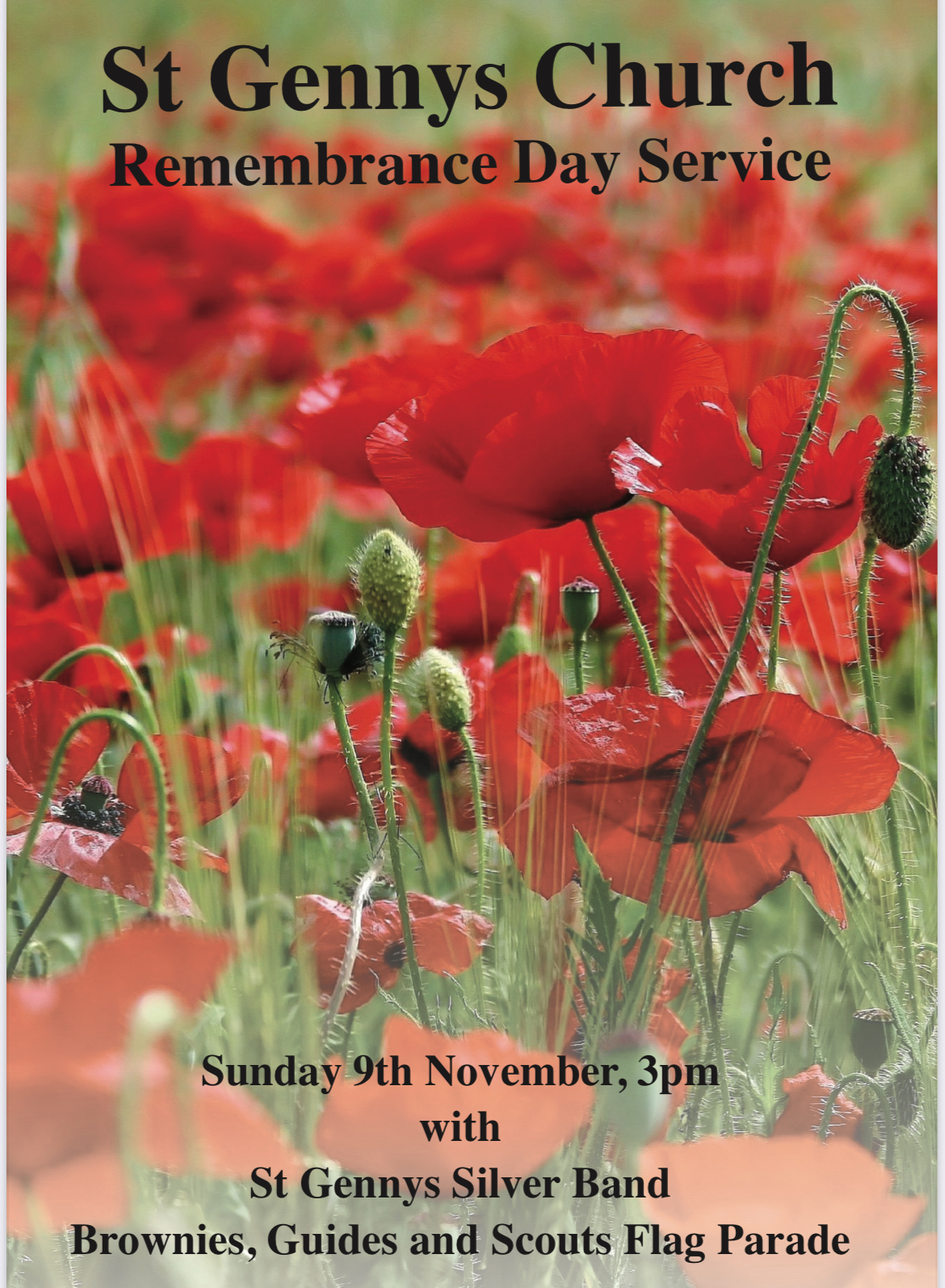 A special Remembrance Sunday service with St Gennys Silver Band and flag parade by Guides, Scouts & Brownies
