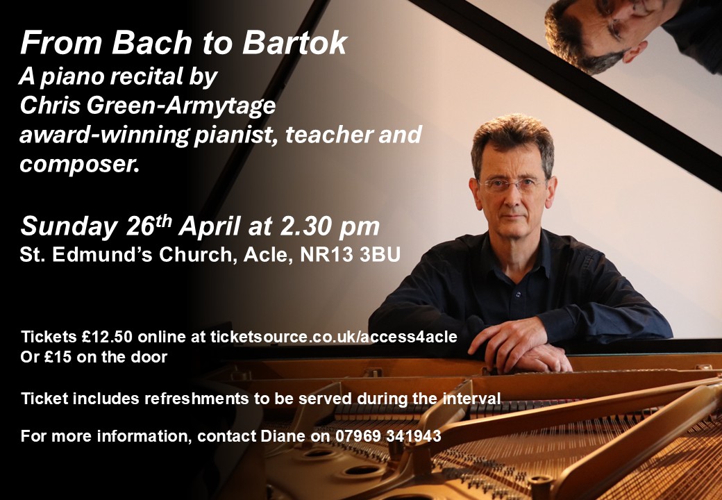 A unique opportunity to hear Chris Green-Armytage giving arecital on our Pleyell piano. Chris is an award winning pianist, teacher and composer.