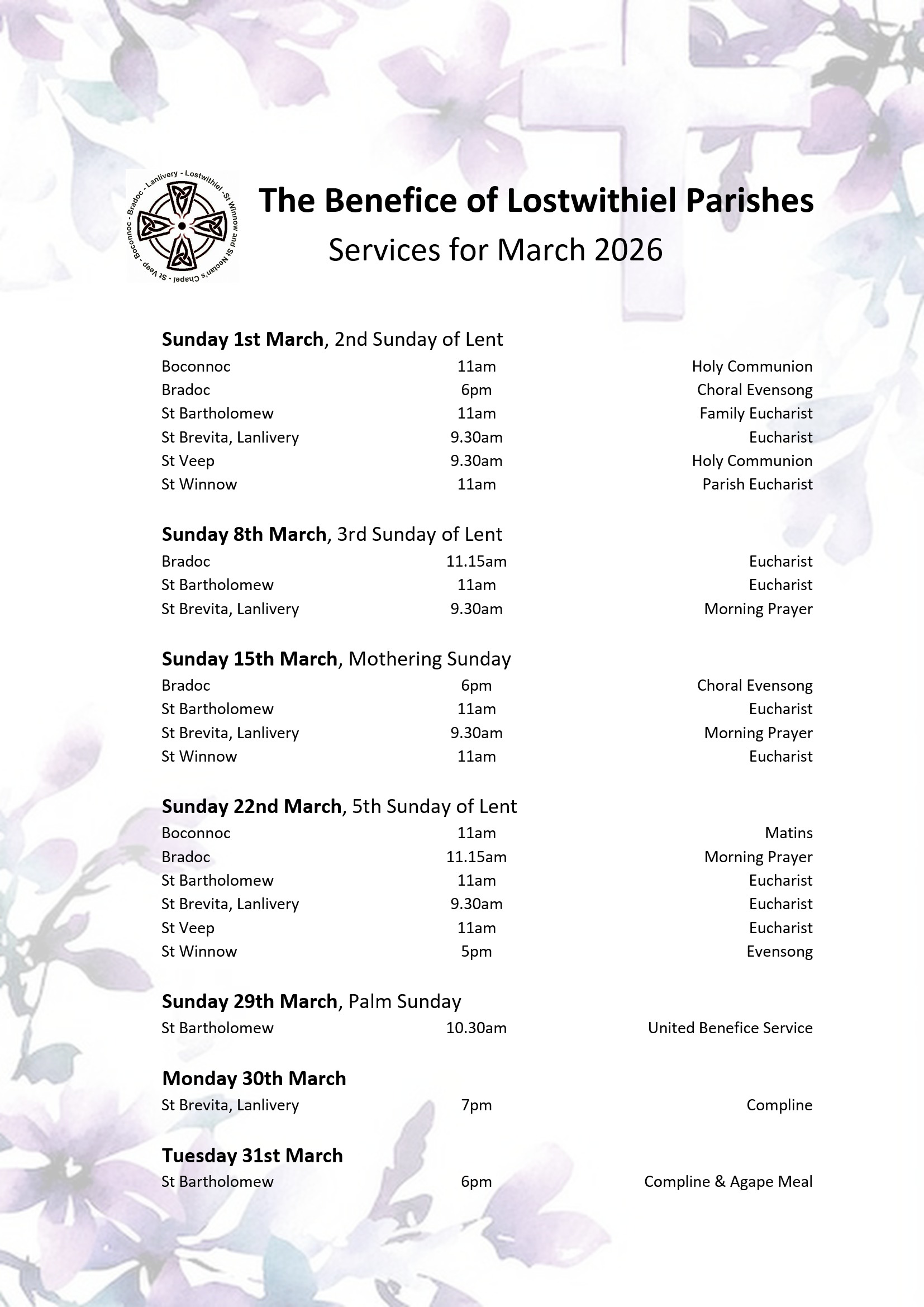 The Benefice rota for March is now available, outlining our services and worship across the churches throughout the month. We warmly invite everyone to join us as we gather in fellowship and prayer during this season.