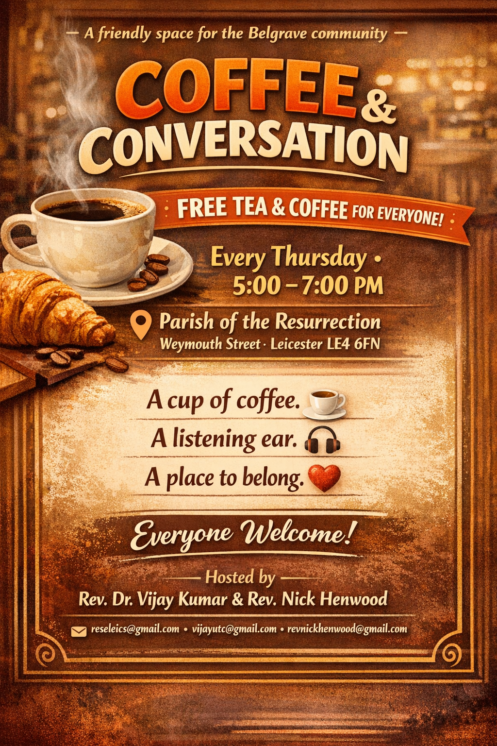 Coffee & Conversation is a relaxed and welcoming space where everyone is invited—whether you are new to the area, exploring faith, or simply looking for a place to connect.