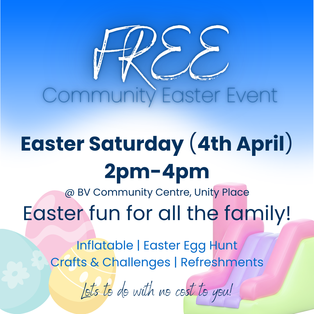 A free event for the whole family with an inflatable, egg hunt, crafts and challenges and refreshments.