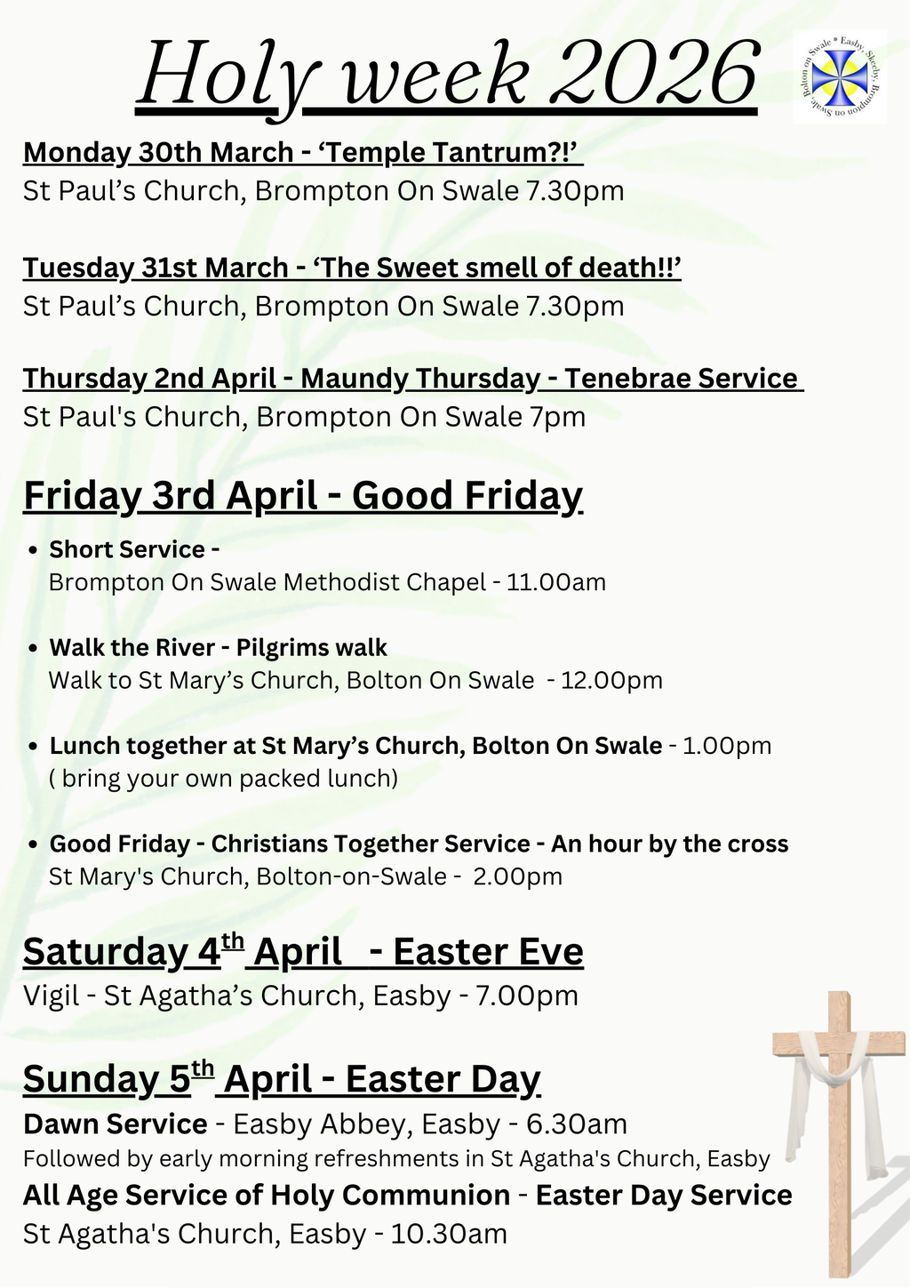 Our parish of Easby with Skeeby and Brompton on Swale and Bolton on Swale is committed to safeguarding children, young people and adults from harm. We follow the House of Bishops guidance and policies and have our own Parish Safeguarding Officer (PSO). Our Diocese of Leeds’s safeguarding pages contain vital links and information including contacts for the Diocesan Safeguarding Advisor who advises our PSO. If you are concerned that a child or adult has been harmed or may be at risk of harm please contact the PSO Mrs Laura Booth - [email protected] or the Diocesan Safeguarding Advisor Jenny Liccardi, Nikki Rose [email protected] . If you have immediate concerns about the safety of someone, please contact the police and your local authority’s children or adult social care services."
