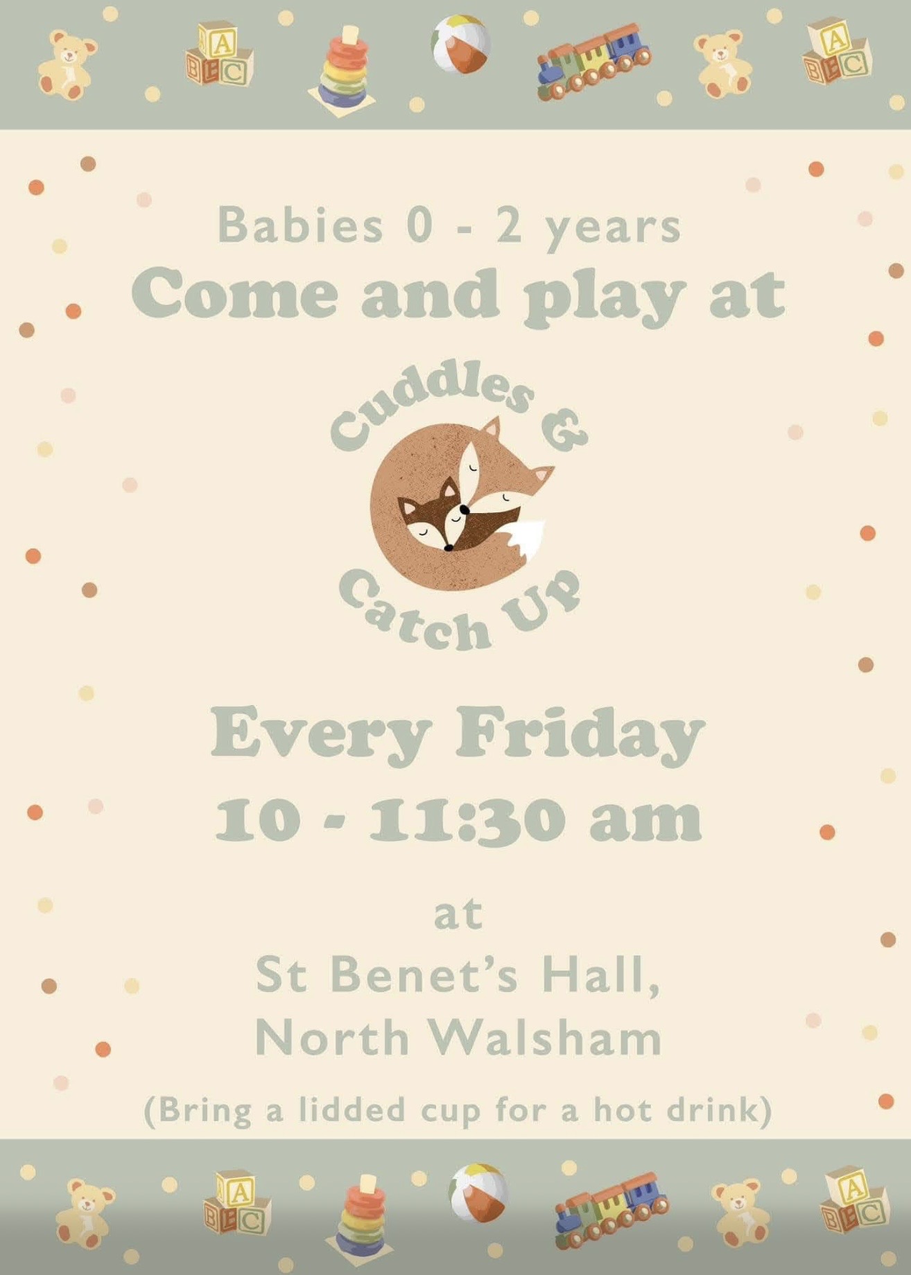 Cuddles and Catch up meets every Friday in the St Benet Hall adjacent to the church, 10am-11.30am for babies, up to around 2 years olf. All welcome!