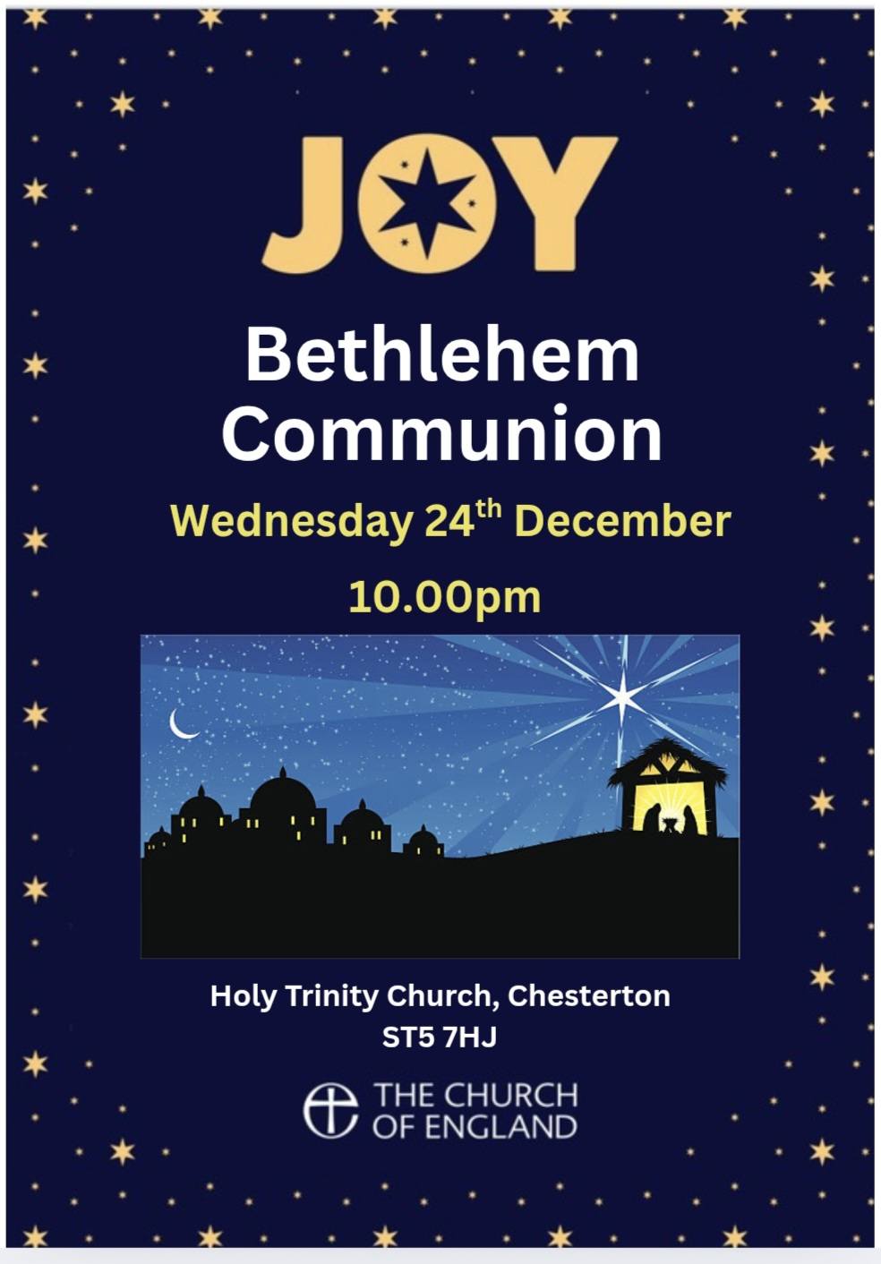 Christmas Services Sunday 14th December 6.00pm Carol Service Wednesday 24th December (Christmas Eve) 4.00pm Candlelit Crib Service 10.00pm Bethlehem Communion Thursday 25th December (Christmas Day) 10.30am Christmas Day Communion