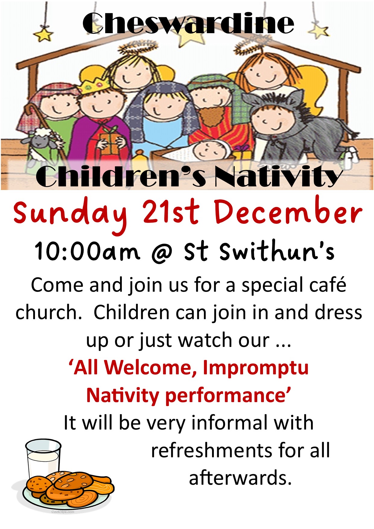 ‘All Welcome, Impromptu Nativity performance’ It will be very informal with refreshments for all afterwards.