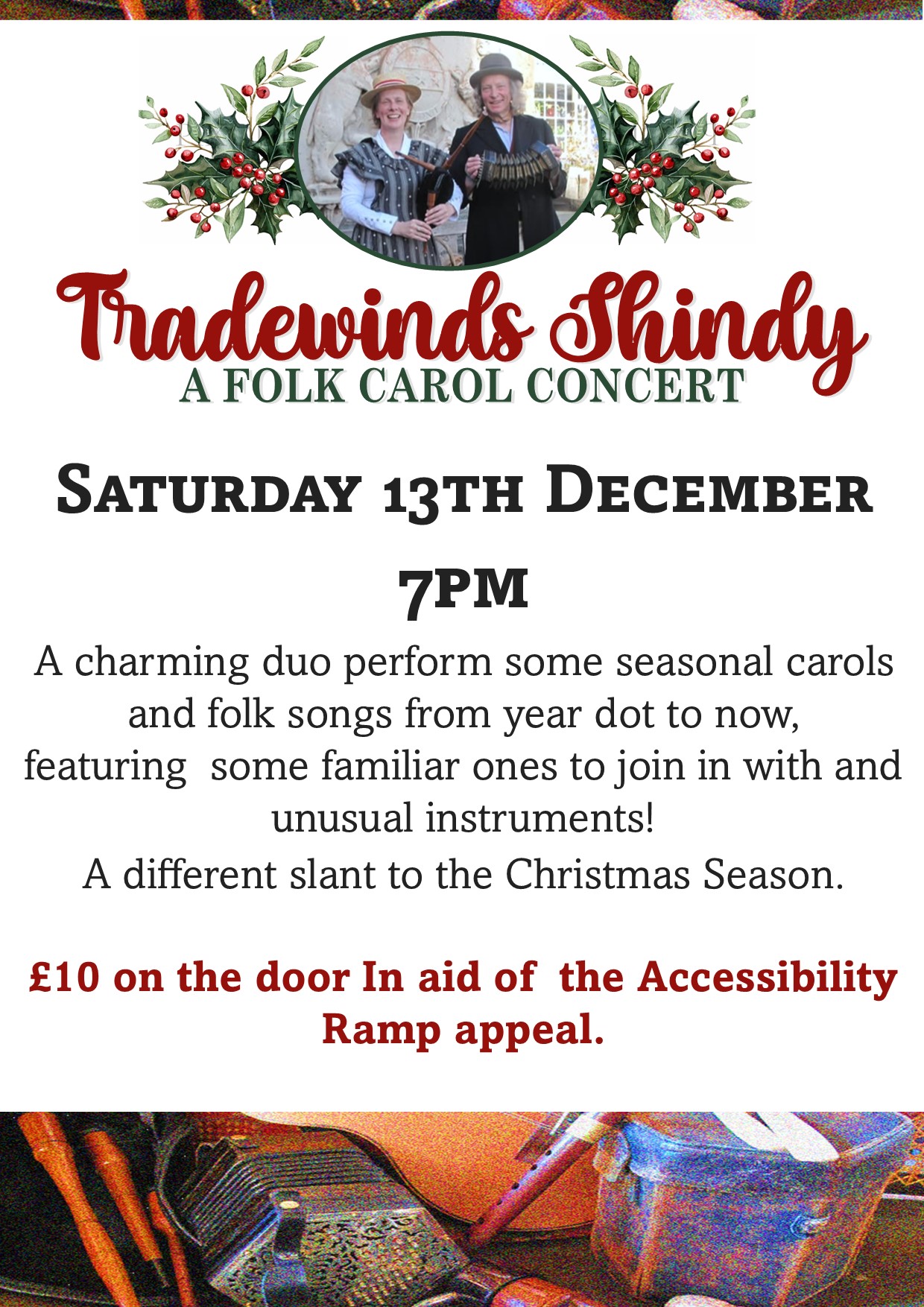 A charming duo perform some seasonal carols and folk songs from year dot to now, featuring some familiar ones to join in with and unusual instruments! A different slant to the Christmas Season. £10 on the door In aid of the Accessibility Ramp appeal.