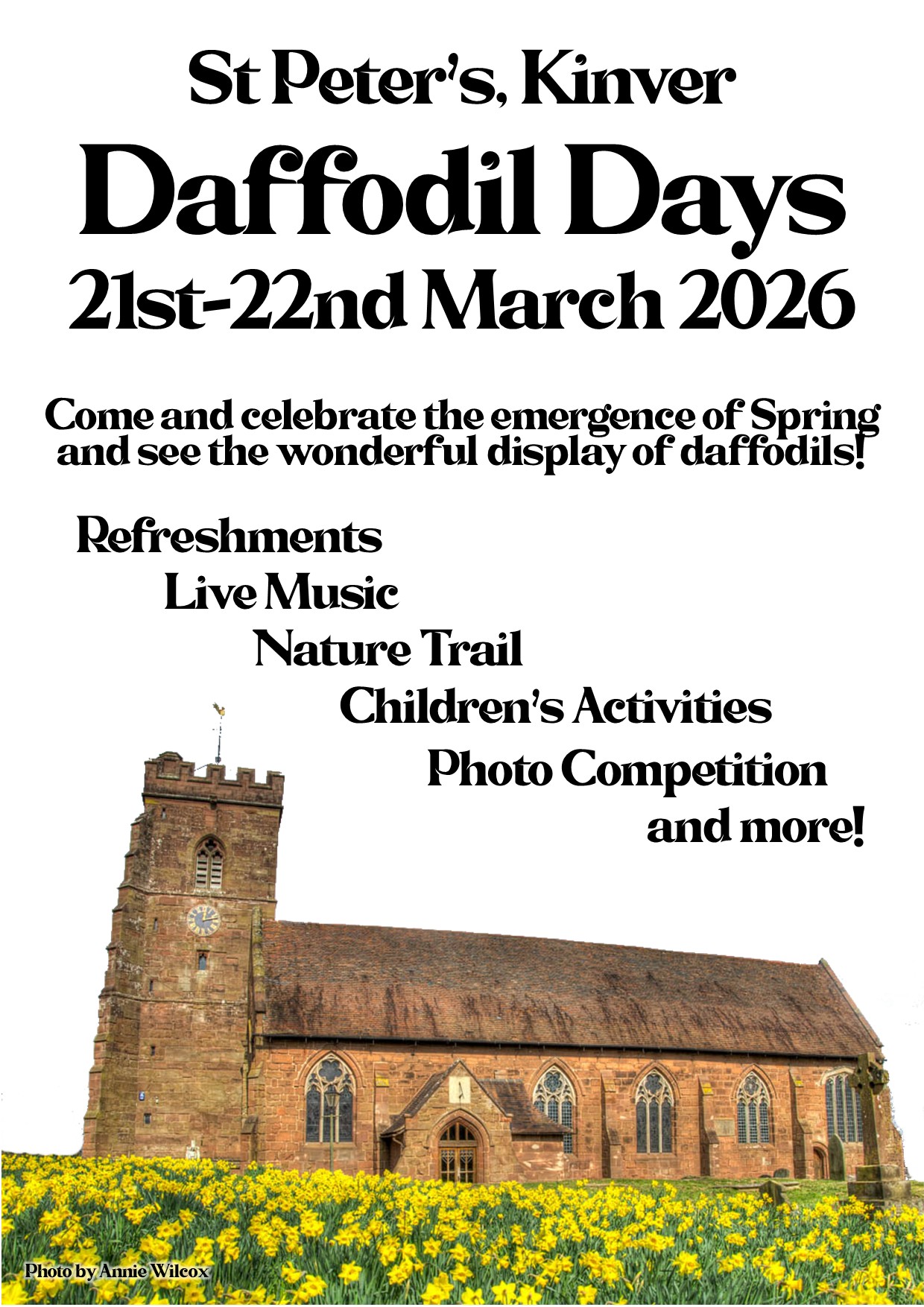 In Spring St Peter's is surrounded by a gorgeous display of hundreds of daffodils. On March 21st and 22nd 2026 we open the church for a two day festival of music, dance, art and poetry. Please join us to welcome the spring. Daffodil Days are always free to attend.