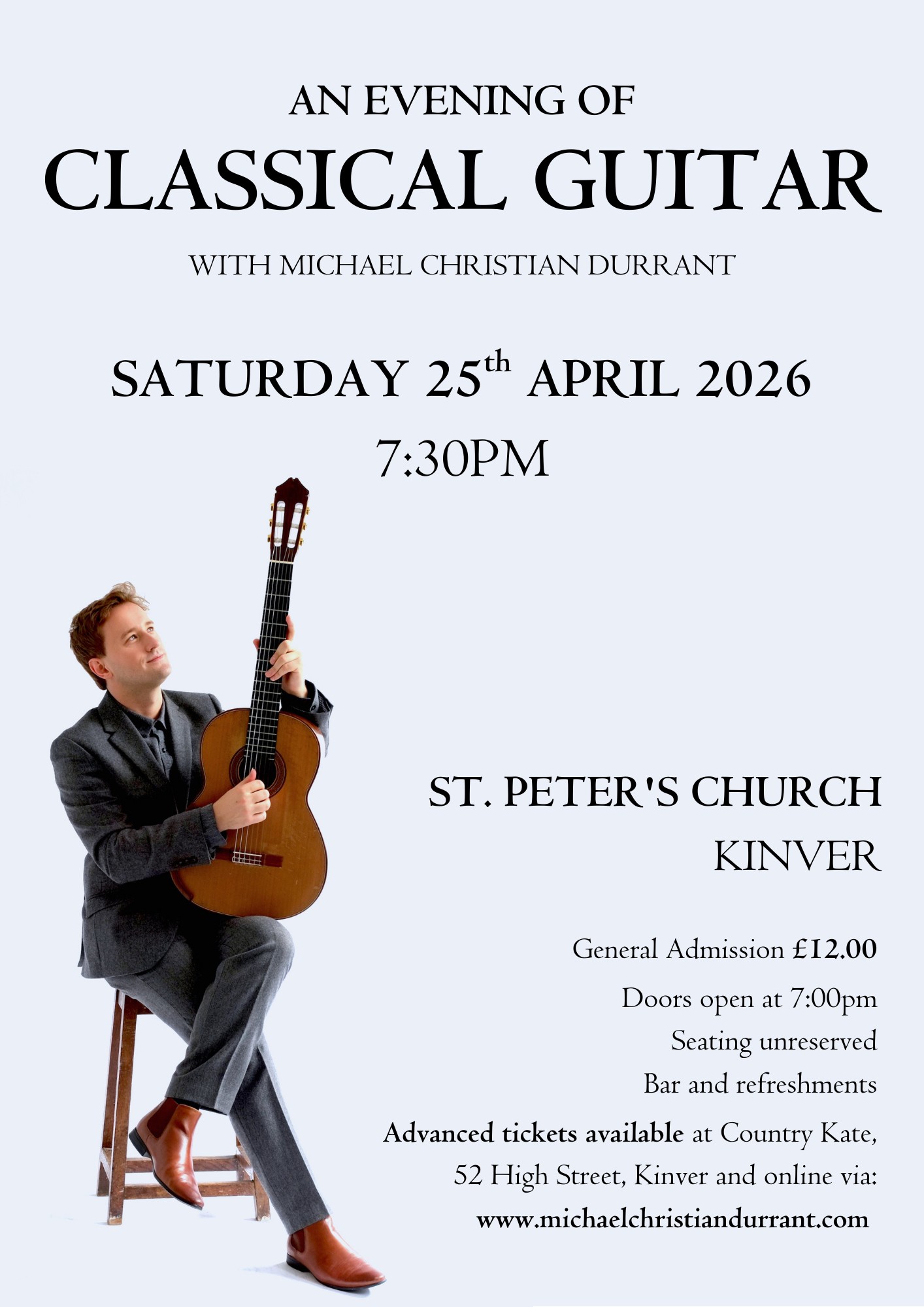 A concert in St Peter's with internationally renowned guitarist. Michael Christian Durrant. The programme spans four centuries and five continents, taking in some of the most beloved pieces ever written for the guitar — from the Elizabethan melody of