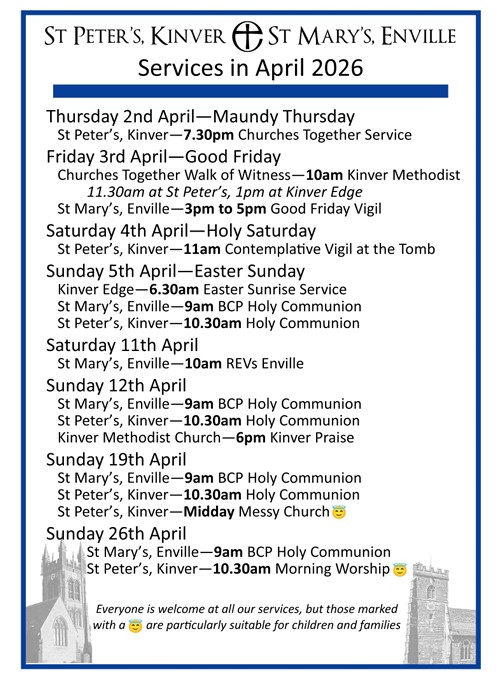 Here are the service details for both churches in the Benefice. We look forward to welcoming you. The services that are particularly child/family friendly are highlighted, but you are very welcome to bring children and babies with you to any service. We have a children's corner in the north aisle with lots of entertaining things to do. There are baby changing facilities in the toilets or in the Foley Chapel.