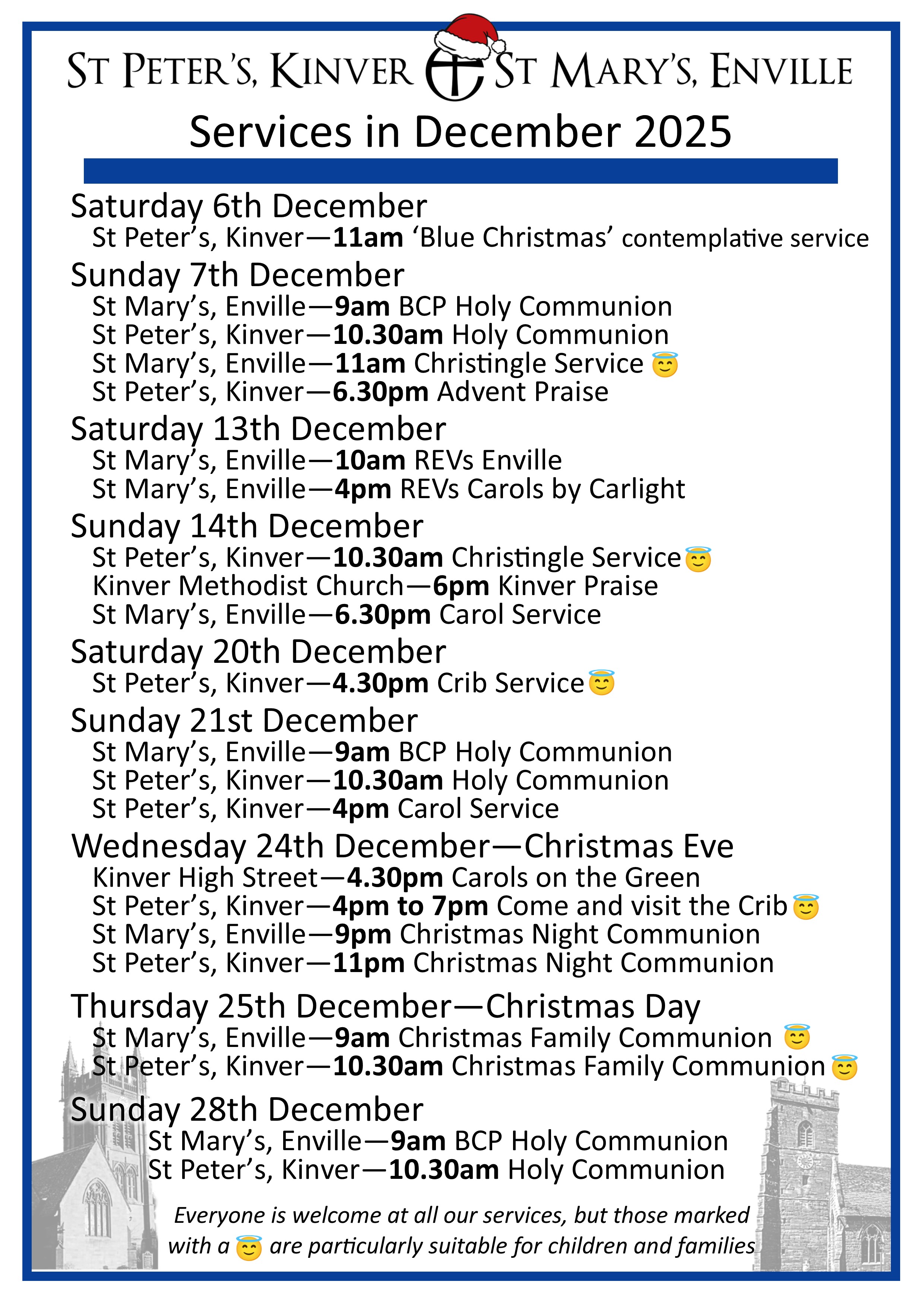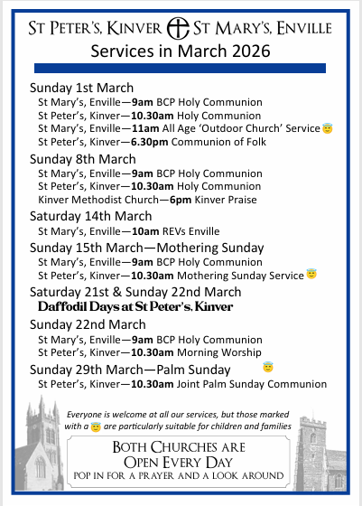Here are the service details for both churches in the Benefice. We look forward to welcoming you. The services that are particularly child/family friendly are highlighted, but you are very welcome to bring children and babies with you to any service. We have a children's corner in the north aisle with lots of entertaining things to do. There are baby changing facilities in the toilets or in the Foley Chapel.