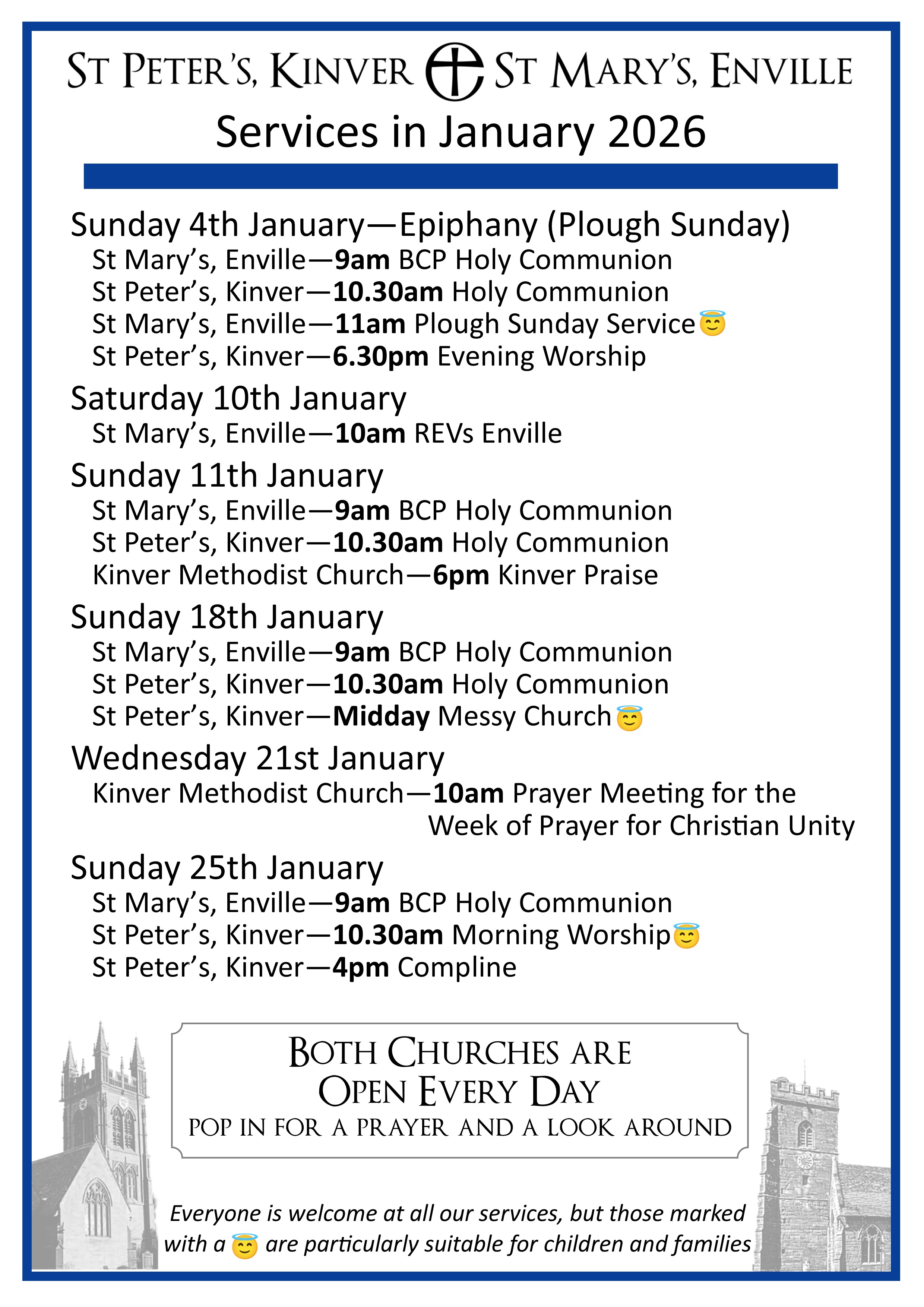 Here are the service details for both churches in the Benefice. We look forward to welcoming you. The services that are particularly child/family friendly are highlighted, but you are very welcome to bring children and babies with you to any service. We have a children's corner in the north aisle with lots of entertaining things to do. There are baby changing facilities in the toilets or in the Foley Chapel.