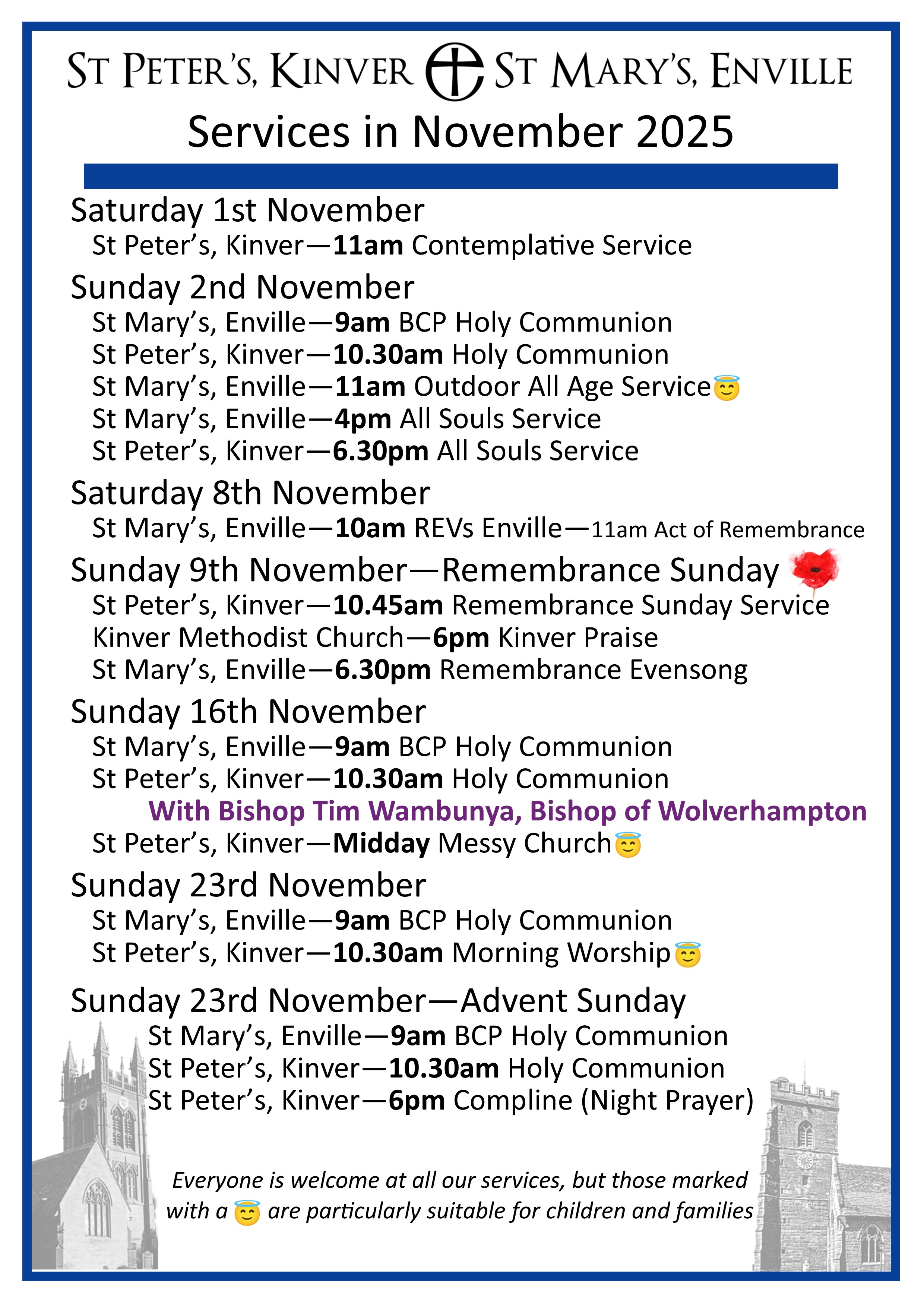 Here are the service details for both churches in the Benefice. We look forward to welcoming you. The services that are particularly child/family friendly are highlighted, but you are very welcome to bring children and babies with you to any service. We have a children's corner in the north aisle with lots of entertaining things to do. There are baby changing facilities in the toilets or in the Foley Chapel.