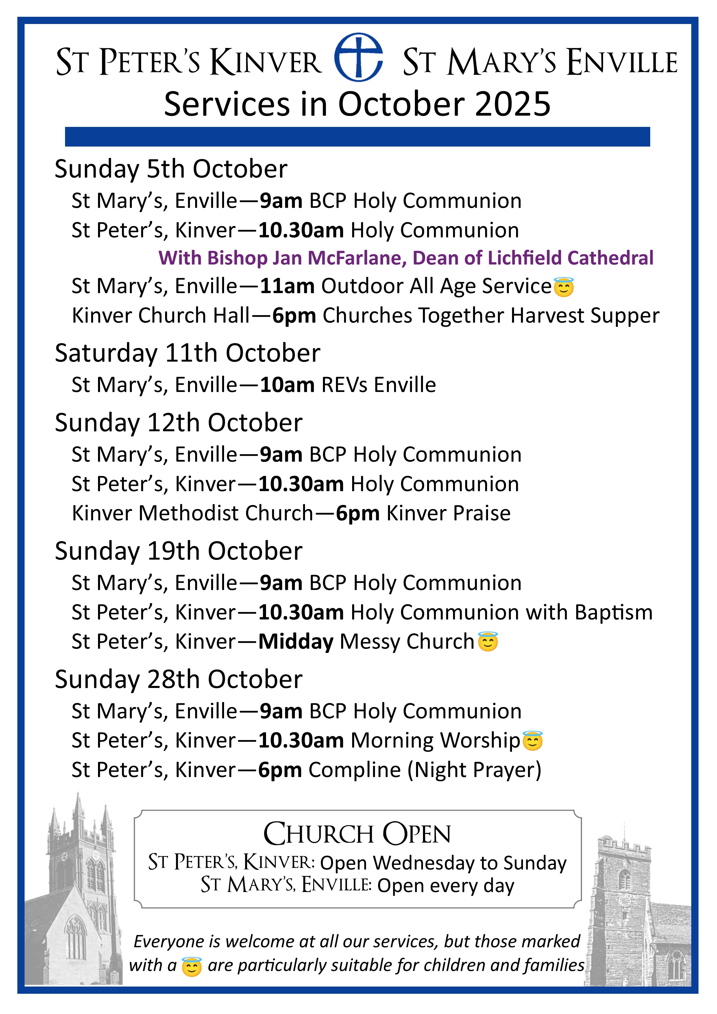 Here are the service details for both churches in the Benefice. We look forward to welcoming you. The services that are particularly child/family friendly are highlighted, but you are very welcome to bring children and babies with you to any service. We have a children's corner in the north aisle with lots of entertaining things to do. There are baby changing facilities in the toilets or in the Foley Chapel.