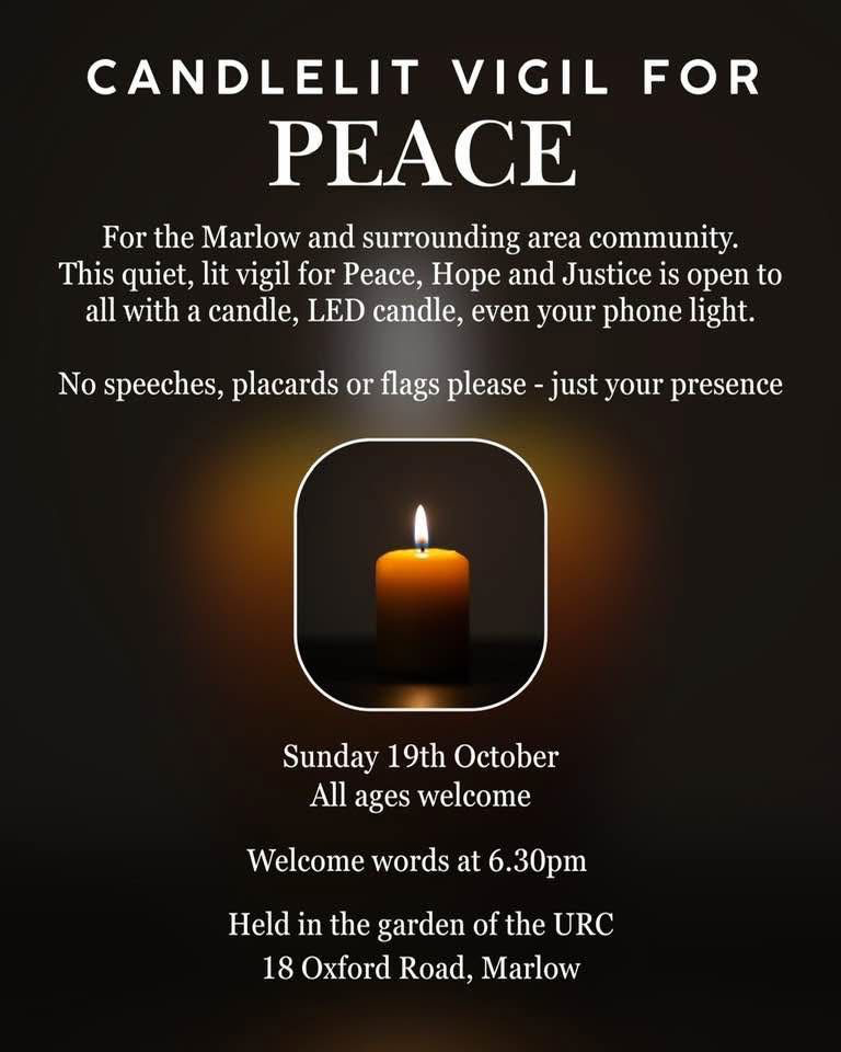 Finally, we would also like to draw your attention to a Candlelit Vigil for Peace which is taking place at 6.30pm this Sunday 19 October in the garden of the United Reform Church in Oxford Road, Marlow. Everyone is welcome.