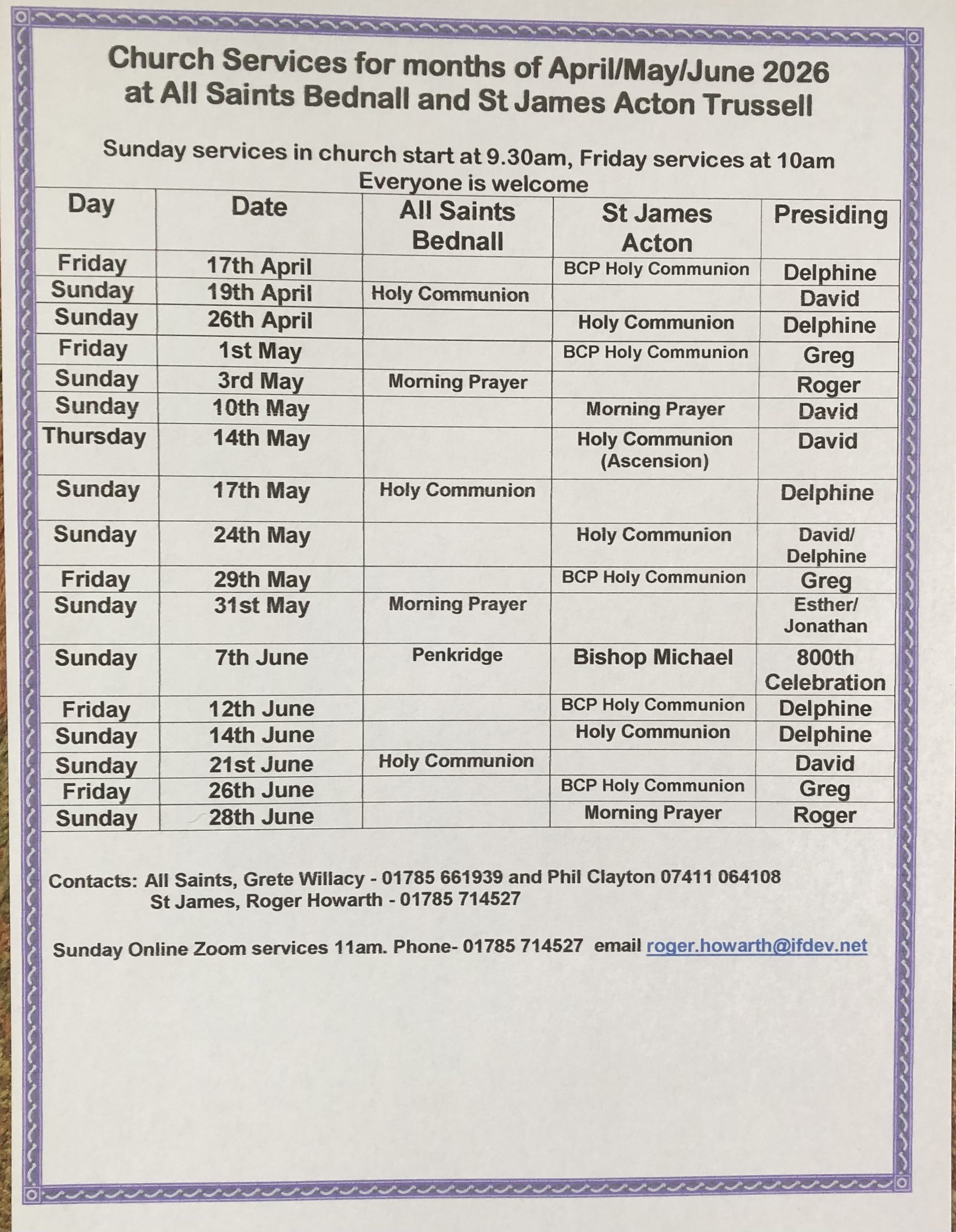 Church Services at Acton and Bednall for 2026 until Easter Sunday 5th April