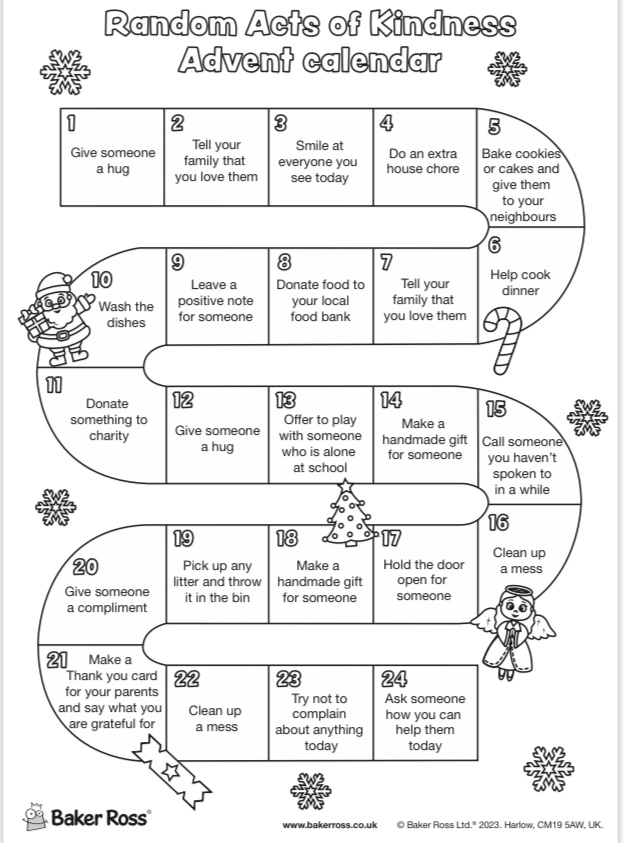 Random Acts of Kindness Advent CalendarThis is a different type of Advent Calendar that has the usual 24 daily boxes but instead of chocolates each day it has a small act of kindness for you to do. You can print off the black and white version, preferably onto card, and colour it in or use the ready coloured one (thanks to Baker Ross for this idea). Hope you enjoy giving these acts of kindness.