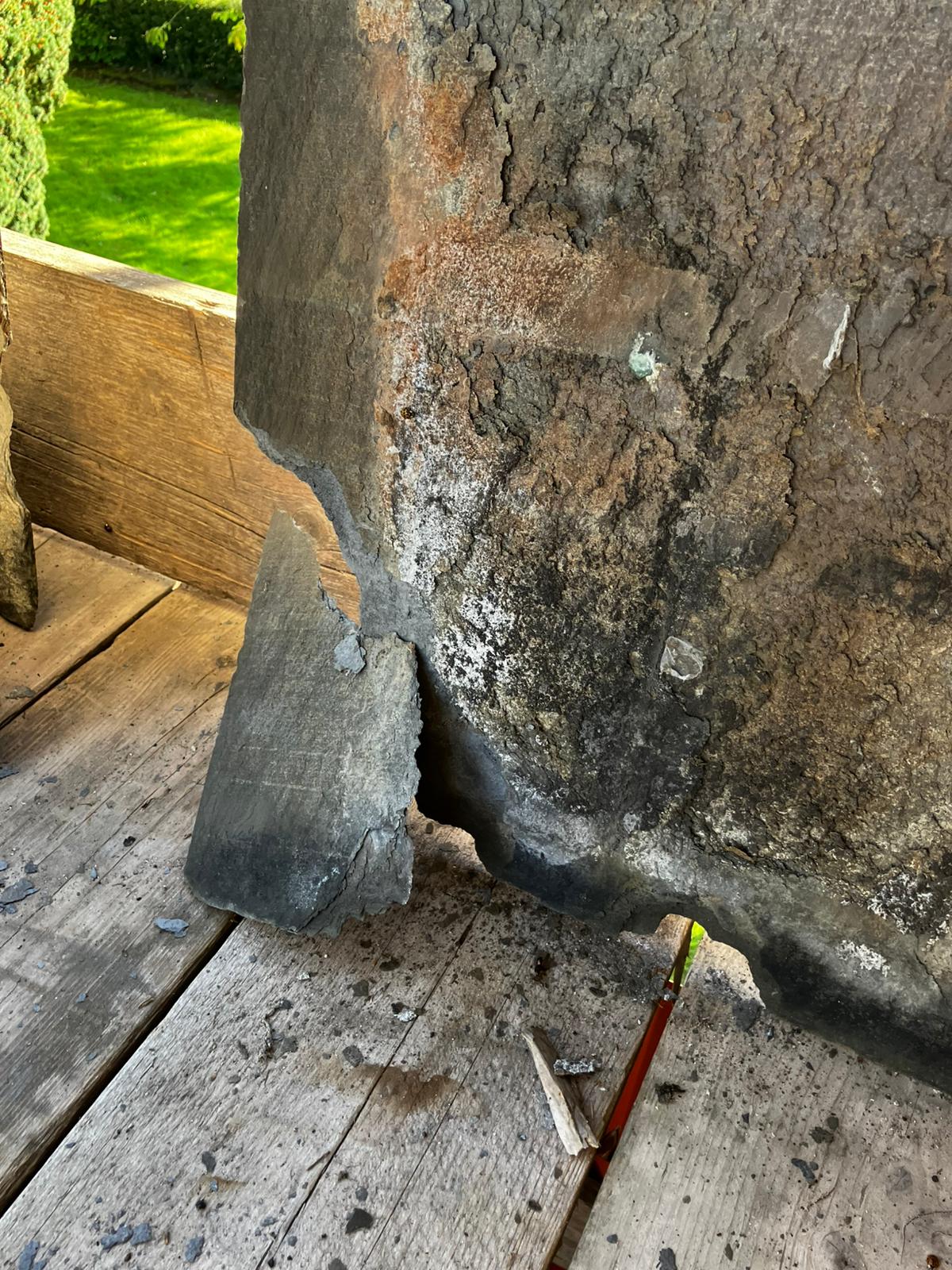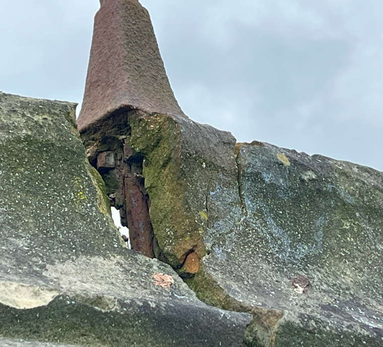 Things look different from on high and we have now found the apex stone is split. And the lean on the bell flèche is of concern. Having done the maths, it appears that the bell flèche is safe and not going to fall down anytime soon. The apex stone can be repaired and pinned, so fortunately the expense of having a new one is not of immediate concern. The interim faculty has been granted to get the work done.