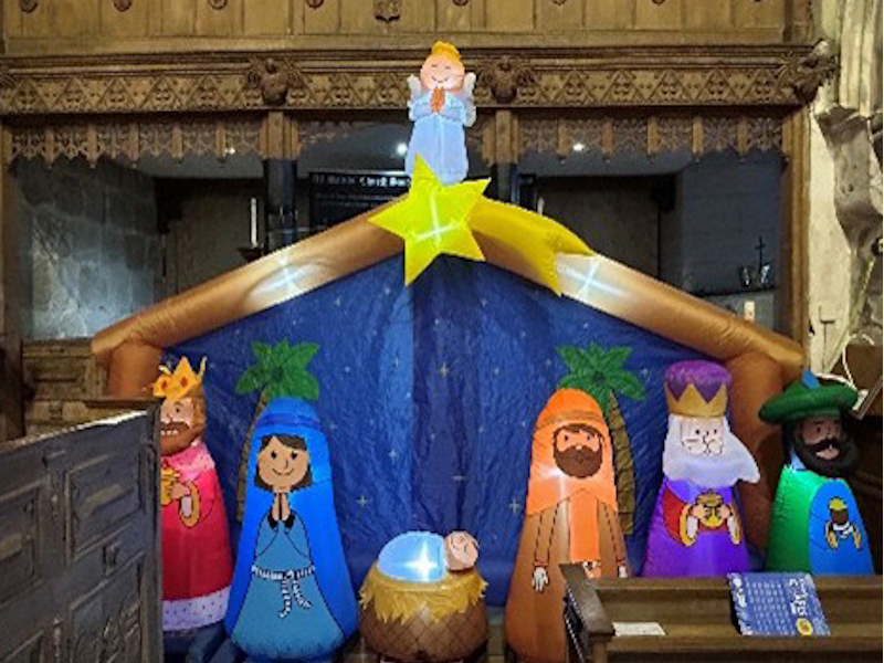 Our annual Christingle Service, led this year by Rev'd Duncan Leake on Christmas Eve, was well-attended. Due to our Heritage works we had no access to the Chancel, but the large inflatable and illuminated nativity supplied by Duncan more than made up for that. Children were invited by Duncan to stand in front of the scene holding battery tea lights to sing Away in a Manger. Some children had photos taken after the service.