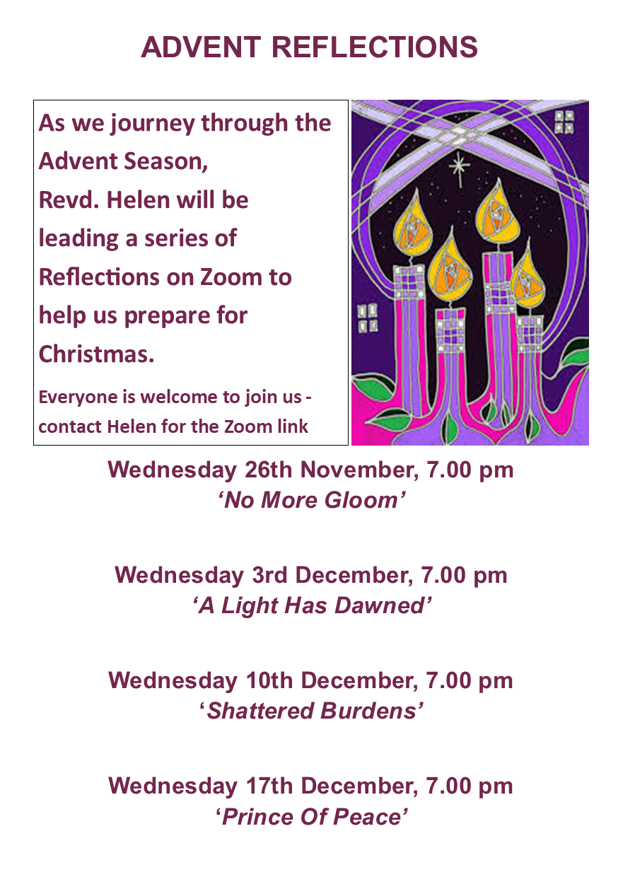 Everyone is welcome to join us for prayer and meditation as we journey through the Season of Advent - Email Rev. Helen for the Zoom link - [email protected]
